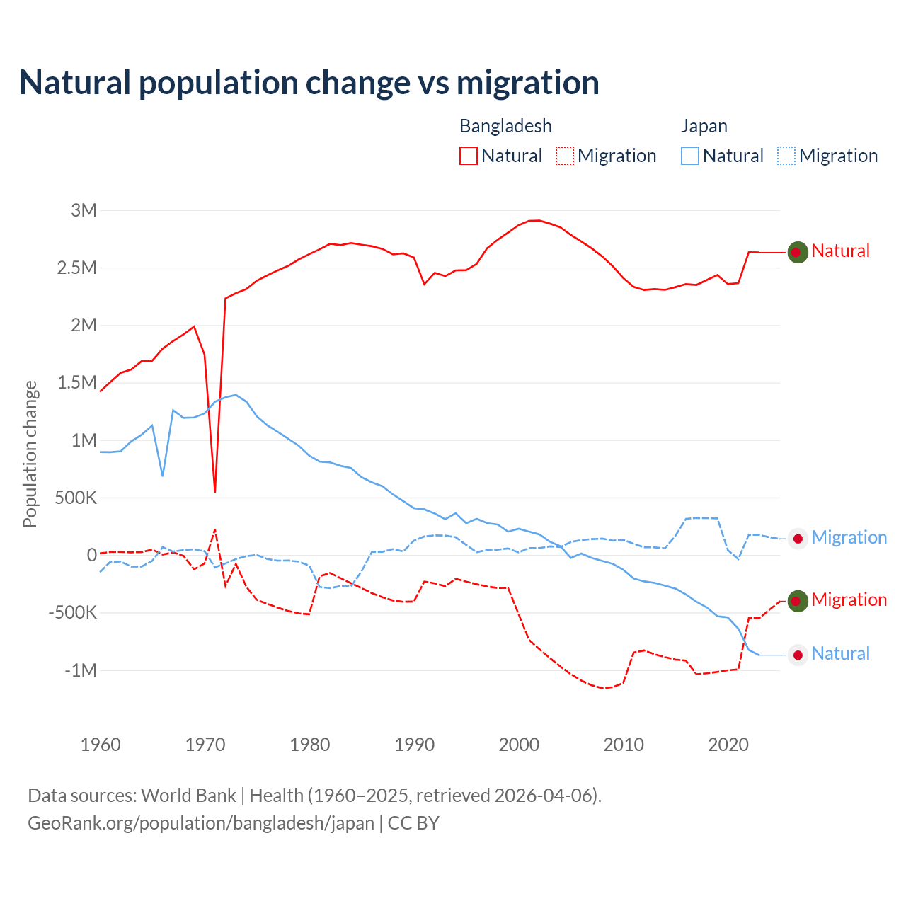 Over the last 10 years, 73.1% of the population change in Bangladesh is from natural causes (a gain of 24,148,039 people) and 26.9% is from migration (a loss of 8,897,408 people). In Japan 73.6% is from natural causes (a loss of 5,178,838 people) and 26.4% is from migration (a gain of 1,860,103 people).