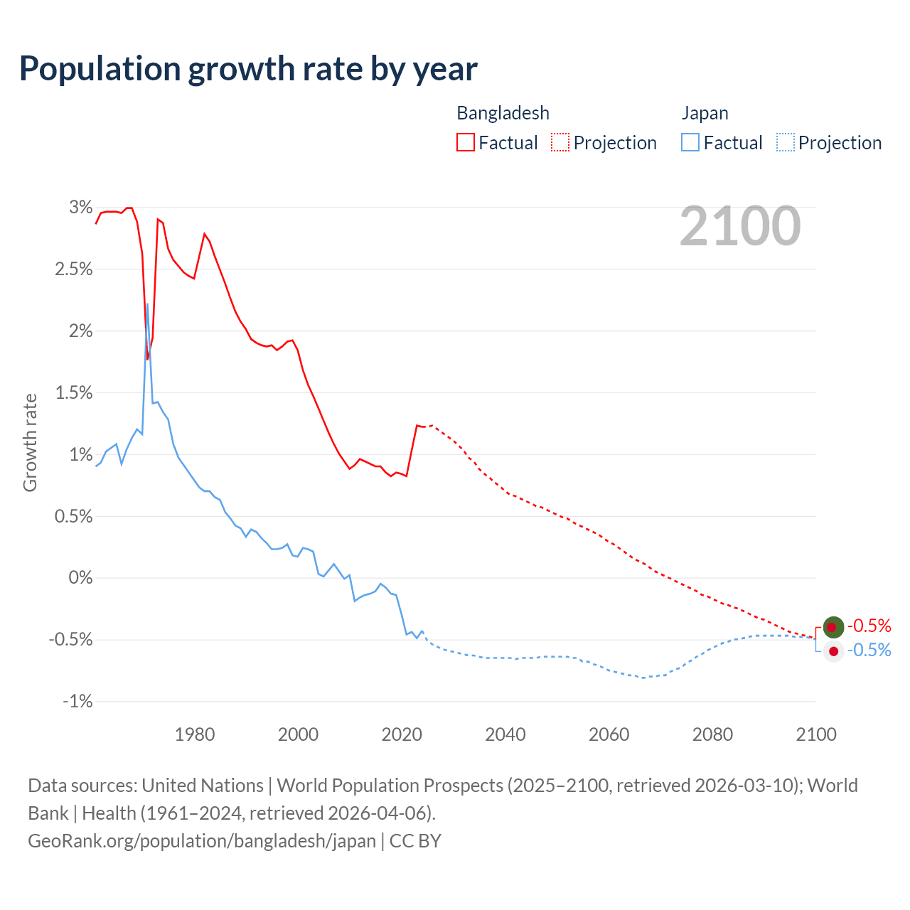 - For the last 10 years, Bangladesh has had an average growth rate of +0.94% per year vs -0.25% in Japan.