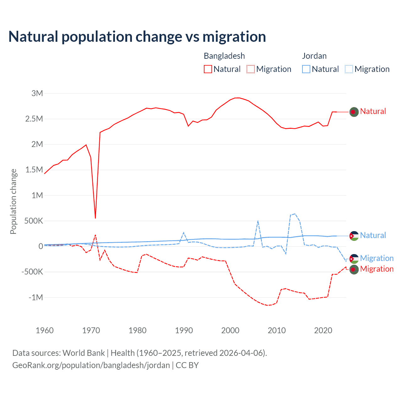 Over the last 10 years, 73.1% of the population change in Bangladesh is from natural causes (a gain of 24,148,039 people) and 26.9% is from migration (a loss of 8,897,408 people). In Jordan 63.2% is from natural causes (a gain of 1,991,452 people) and 36.8% is from migration (a gain of 1,157,625 people).