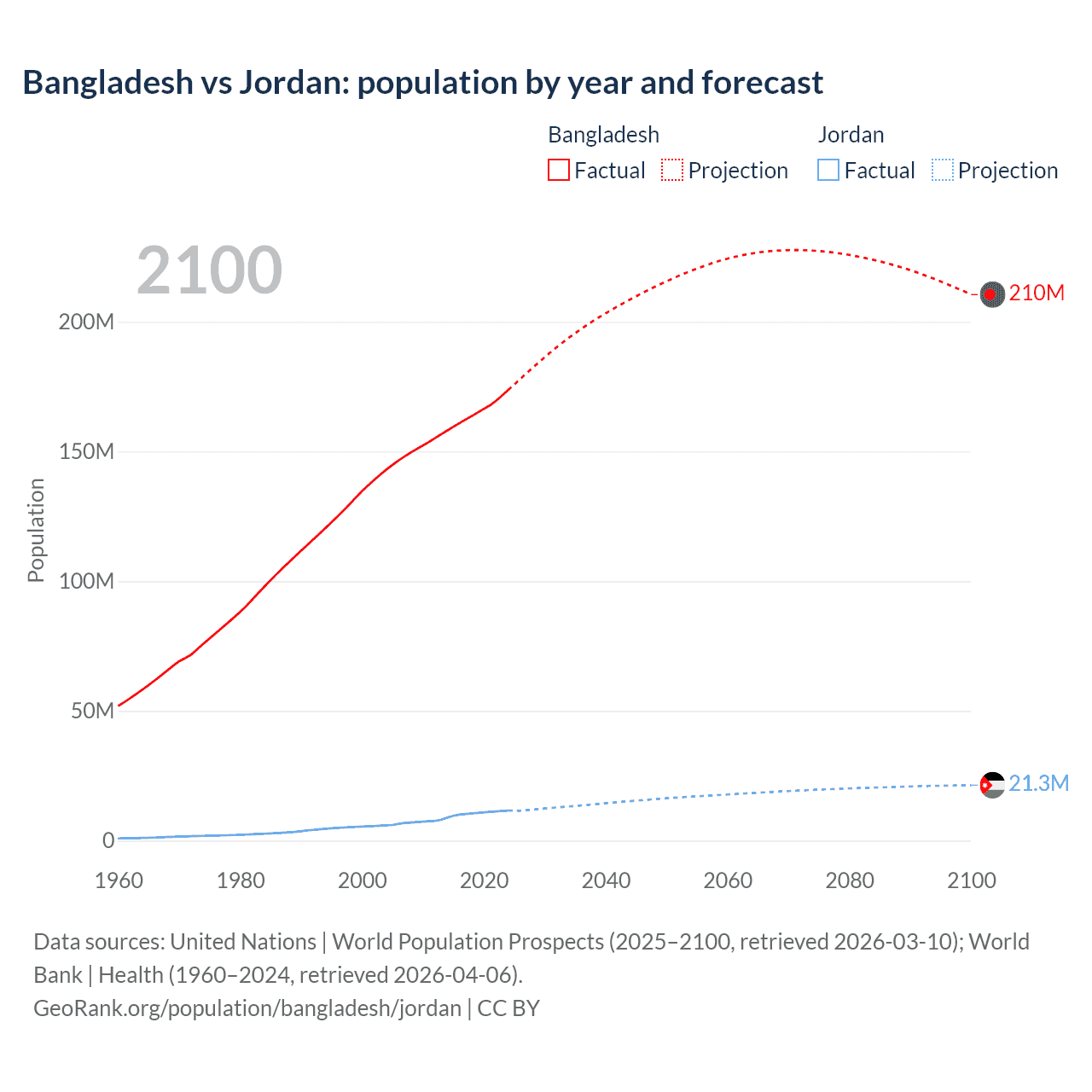 The latest officially reported population of Bangladesh was 173,562,364 in 2024 vs 11,552,876 people in Jordan in 2024. In 2026, based on the adjusted UN estimation, the current Bangladesh's population is 178,415,186 people compared to 11,555,022 in Jordan.