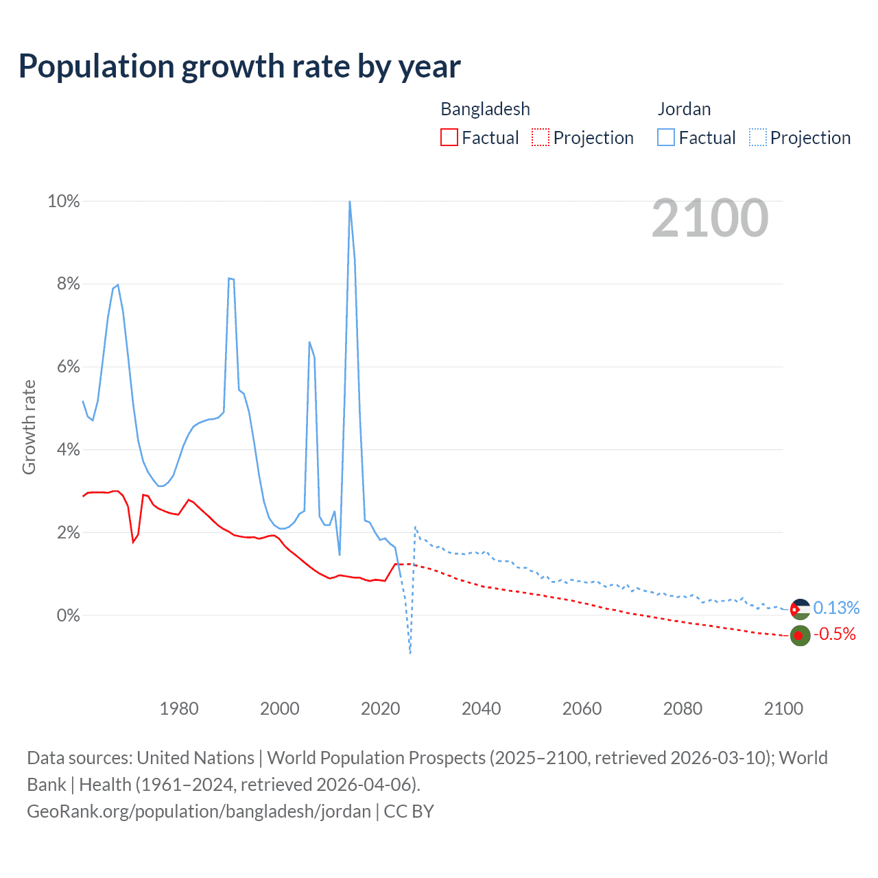 - For the last 10 years, Bangladesh has had an average growth rate of +0.94% per year vs +3.45% in Jordan.