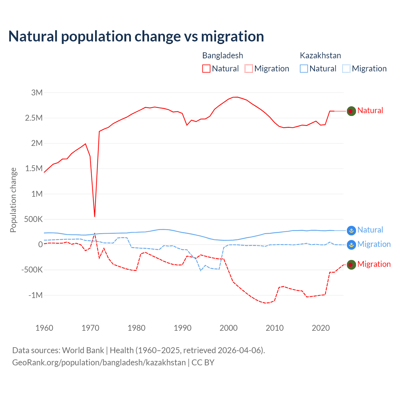 Over the last 10 years, 73.1% of the population change in Bangladesh is from natural causes (a gain of 24,148,039 people) and 26.9% is from migration (a loss of 8,897,408 people). In Kazakhstan 98.7% is from natural causes (a gain of 2,743,094 people) and 1.33% is from migration (a gain of 36,908 people).