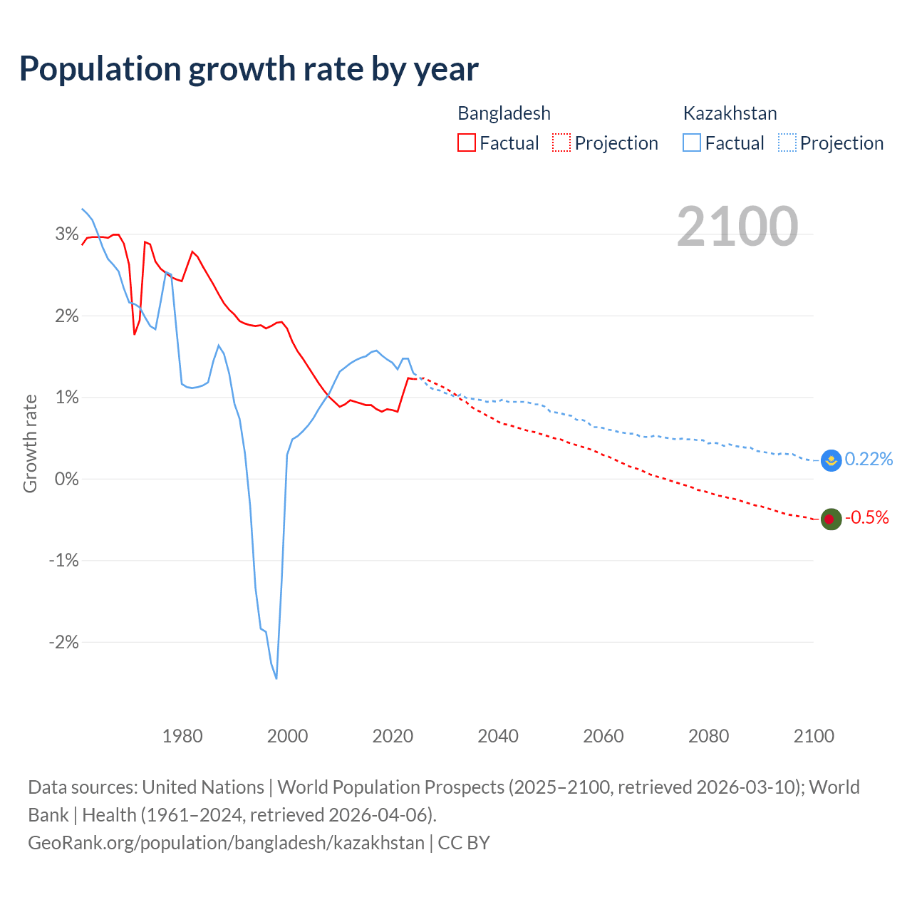 - For the last 10 years, Bangladesh has had an average growth rate of +0.94% per year vs +1.46% in Kazakhstan.
