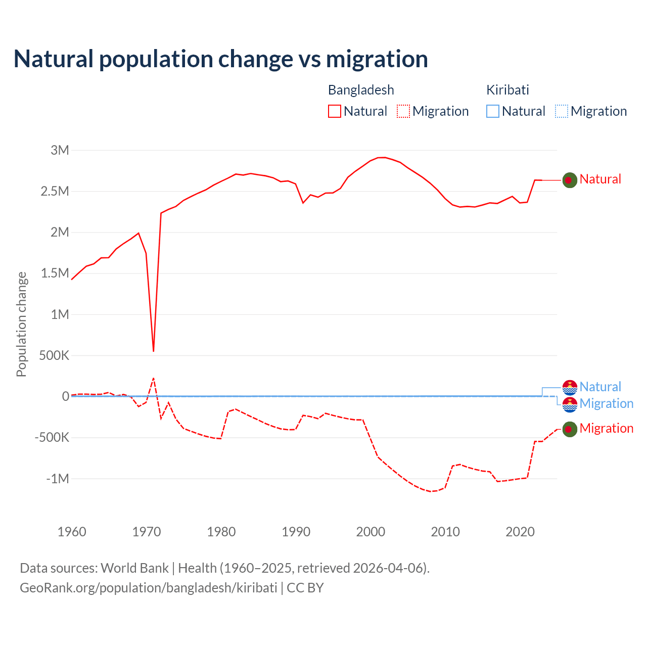 Over the last 10 years, 73.1% of the population change in Bangladesh is from natural causes (a gain of 24,148,039 people) and 26.9% is from migration (a loss of 8,897,408 people). In Kiribati 80% is from natural causes (a gain of 25,262 people) and 20% is from migration (a loss of 6,330 people).