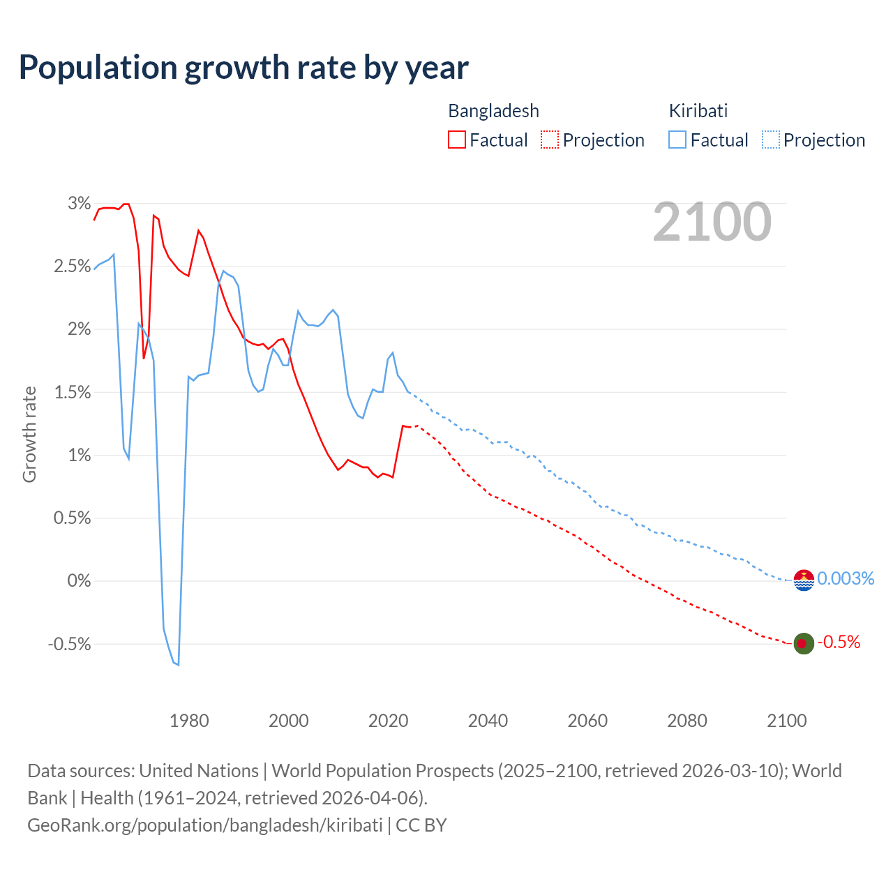 - For the last 10 years, Bangladesh has had an average growth rate of +0.94% per year vs +1.53% in Kiribati.