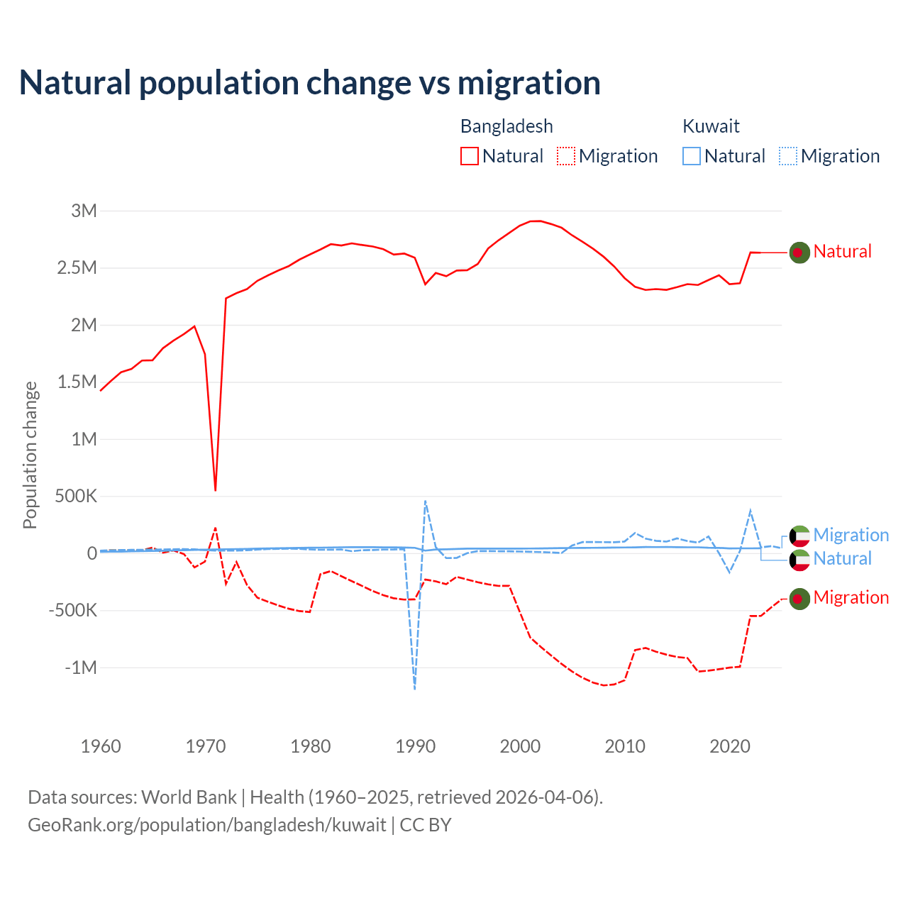Over the last 10 years, 73.1% of the population change in Bangladesh is from natural causes (a gain of 24,148,039 people) and 26.9% is from migration (a loss of 8,897,408 people). In Kuwait 35.8% is from natural causes (a gain of 470,645 people) and 64.2% is from migration (a gain of 845,142 people).