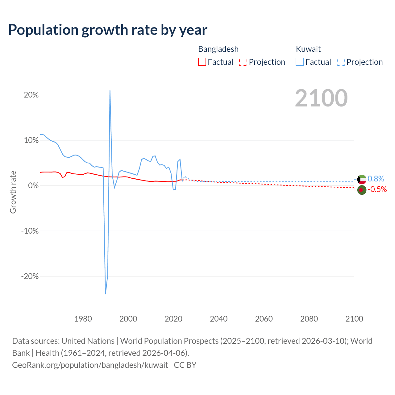 - For the last 10 years, Bangladesh has had an average growth rate of +0.94% per year vs +3.1% in Kuwait.