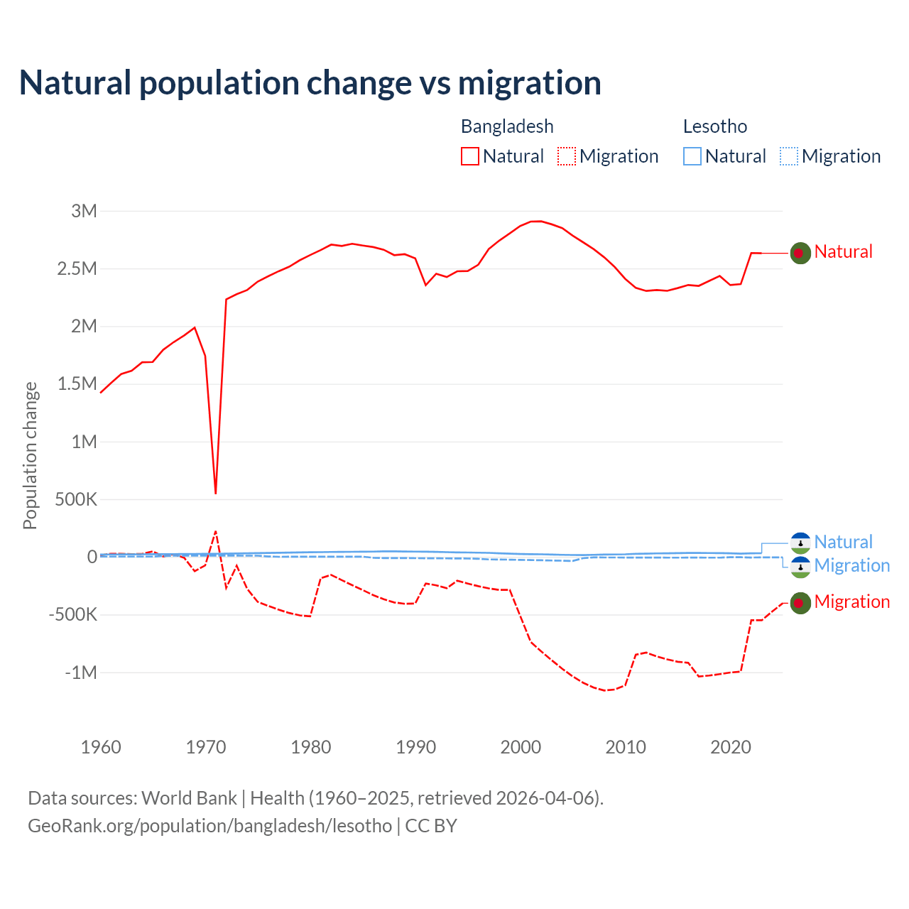 Over the last 10 years, 73.1% of the population change in Bangladesh is from natural causes (a gain of 24,148,039 people) and 26.9% is from migration (a loss of 8,897,408 people). In Lesotho 84.2% is from natural causes (a gain of 315,836 people) and 15.8% is from migration (a loss of 59,457 people).