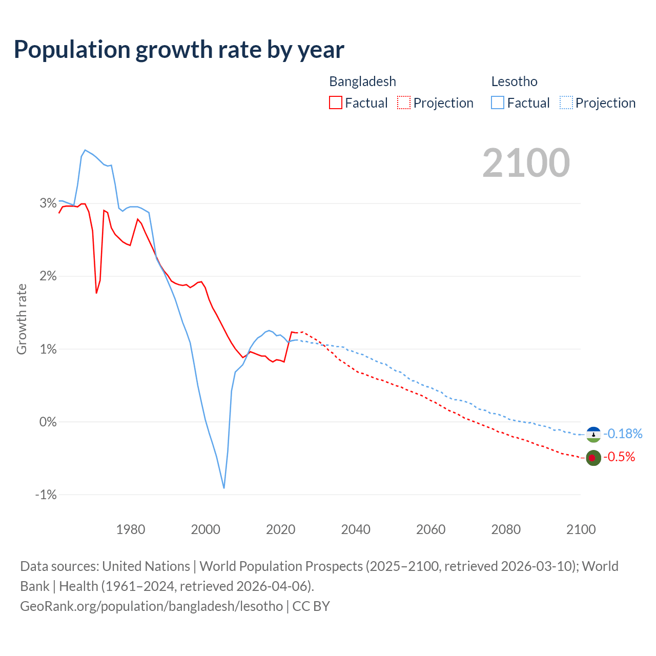 - For the last 10 years, Bangladesh has had an average growth rate of +0.94% per year vs +1.17% in Lesotho.