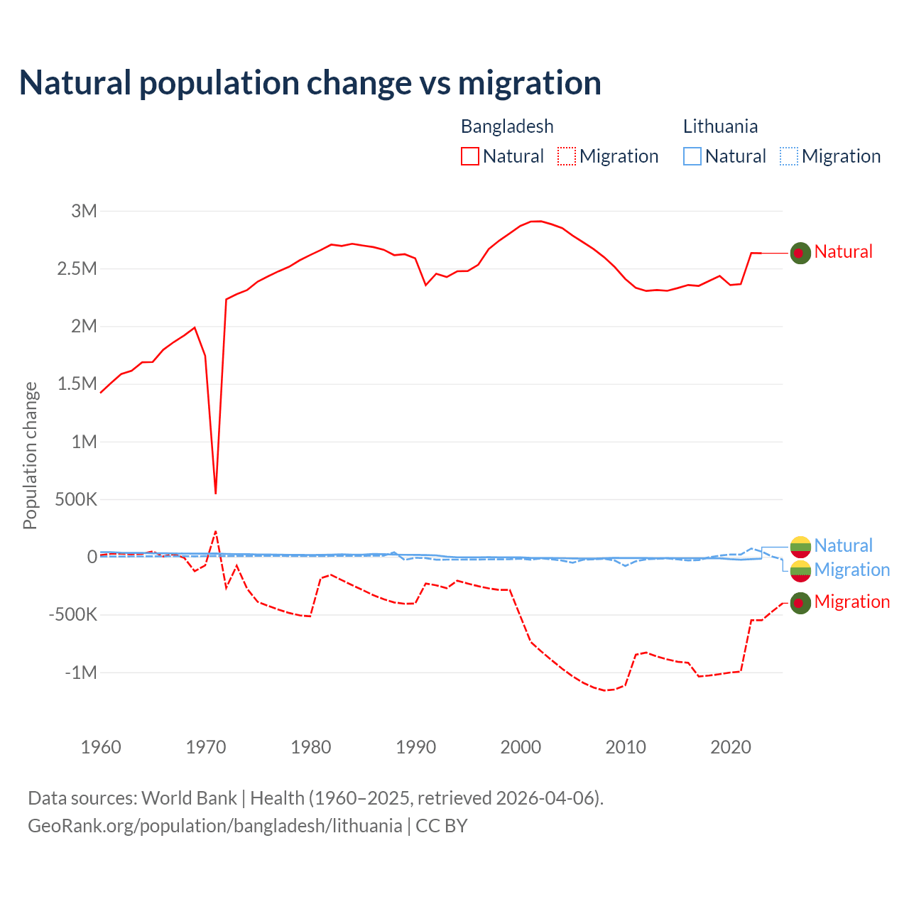 Over the last 10 years, 73.1% of the population change in Bangladesh is from natural causes (a gain of 24,148,039 people) and 26.9% is from migration (a loss of 8,897,408 people). In Lithuania 68.7% is from natural causes (a loss of 153,859 people) and 31.3% is from migration (a gain of 70,196 people).