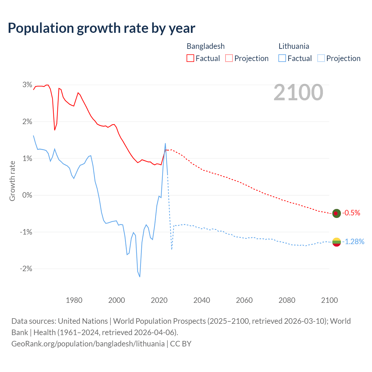 - For the last 10 years, Bangladesh has had an average growth rate of +0.94% per year vs -0.22% in Lithuania.