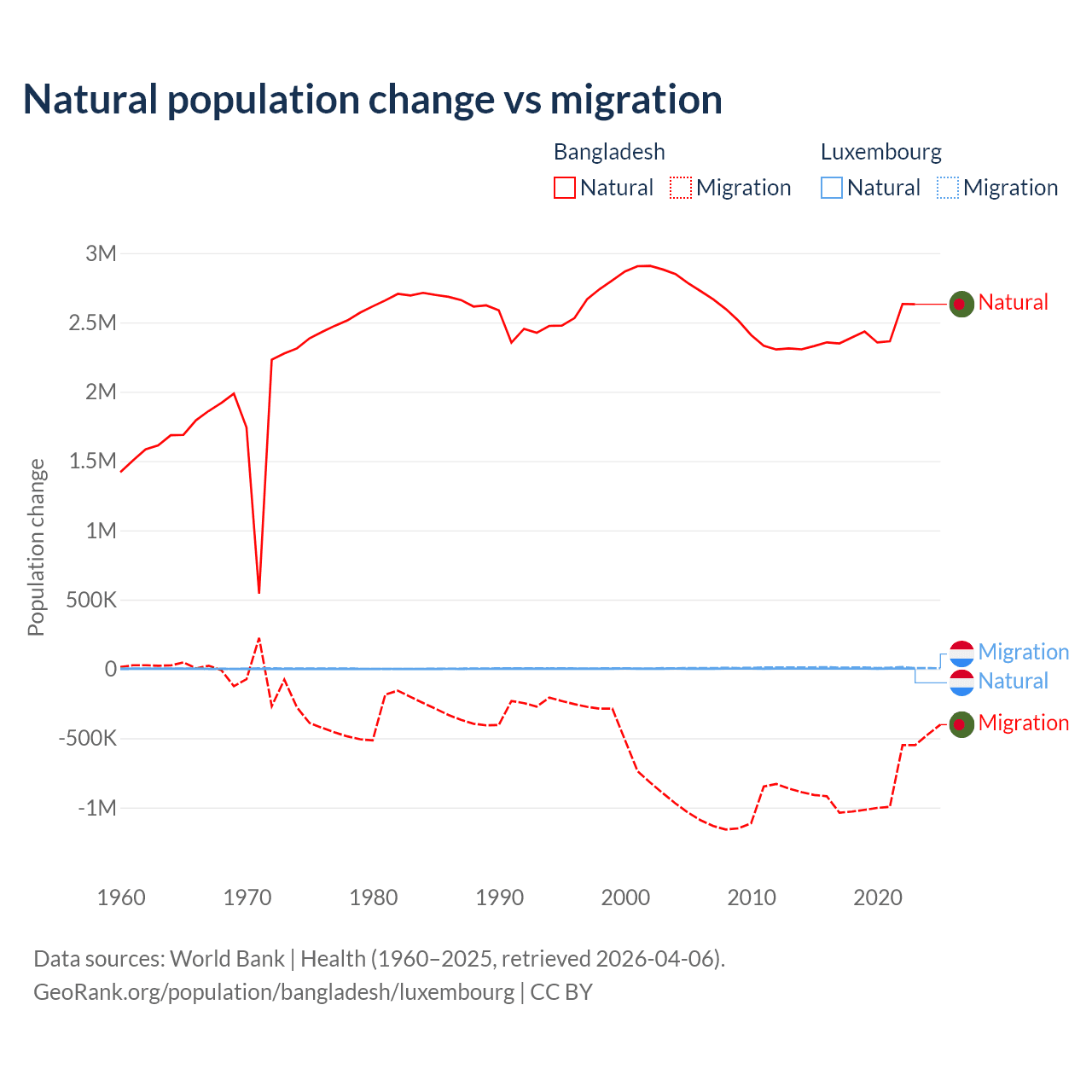Over the last 10 years, 73.1% of the population change in Bangladesh is from natural causes (a gain of 24,148,039 people) and 26.9% is from migration (a loss of 8,897,408 people). In Luxembourg 16.8% is from natural causes (a gain of 20,287 people) and 83.2% is from migration (a gain of 100,435 people).