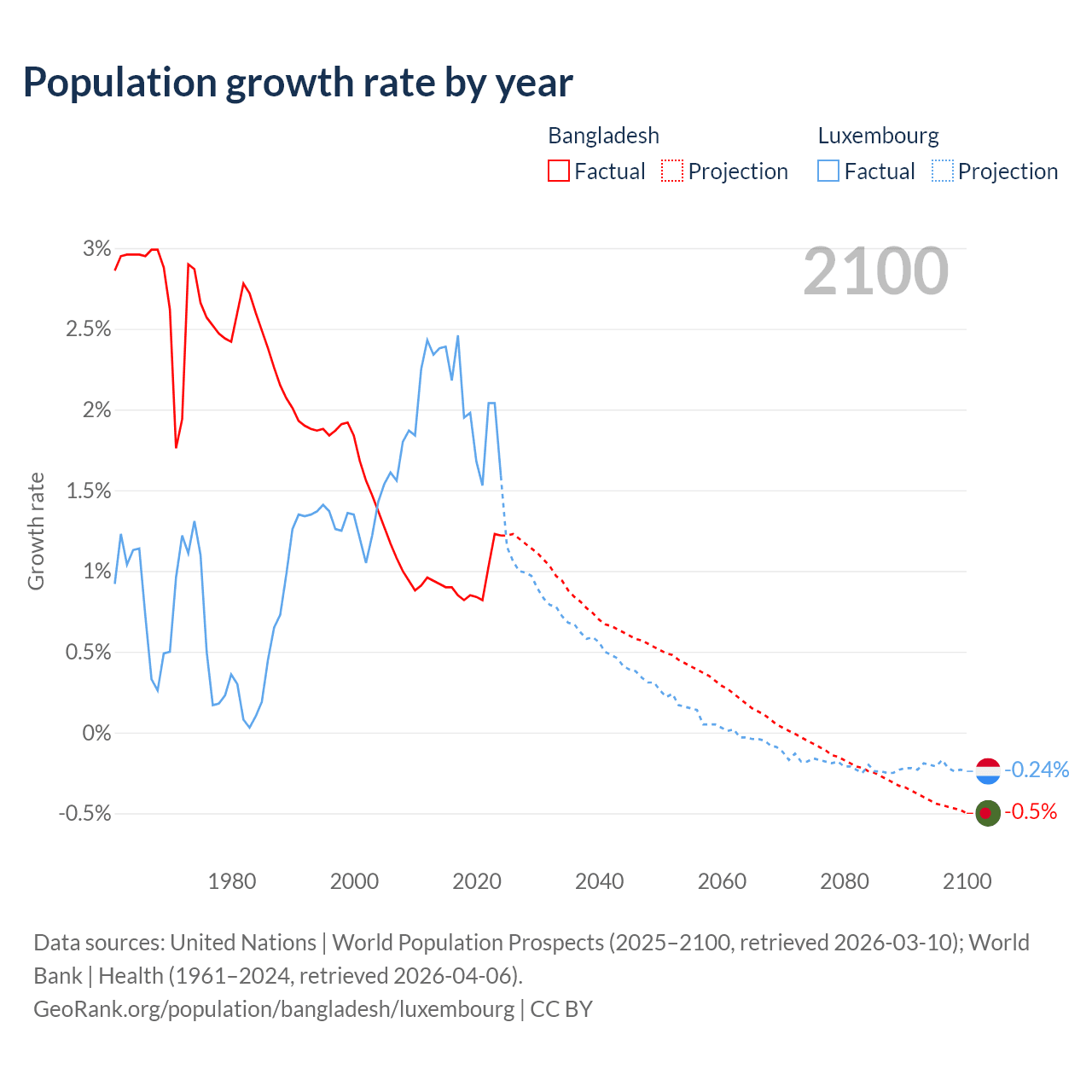 - For the last 10 years, Bangladesh has had an average growth rate of +0.94% per year vs +2.02% in Luxembourg.
