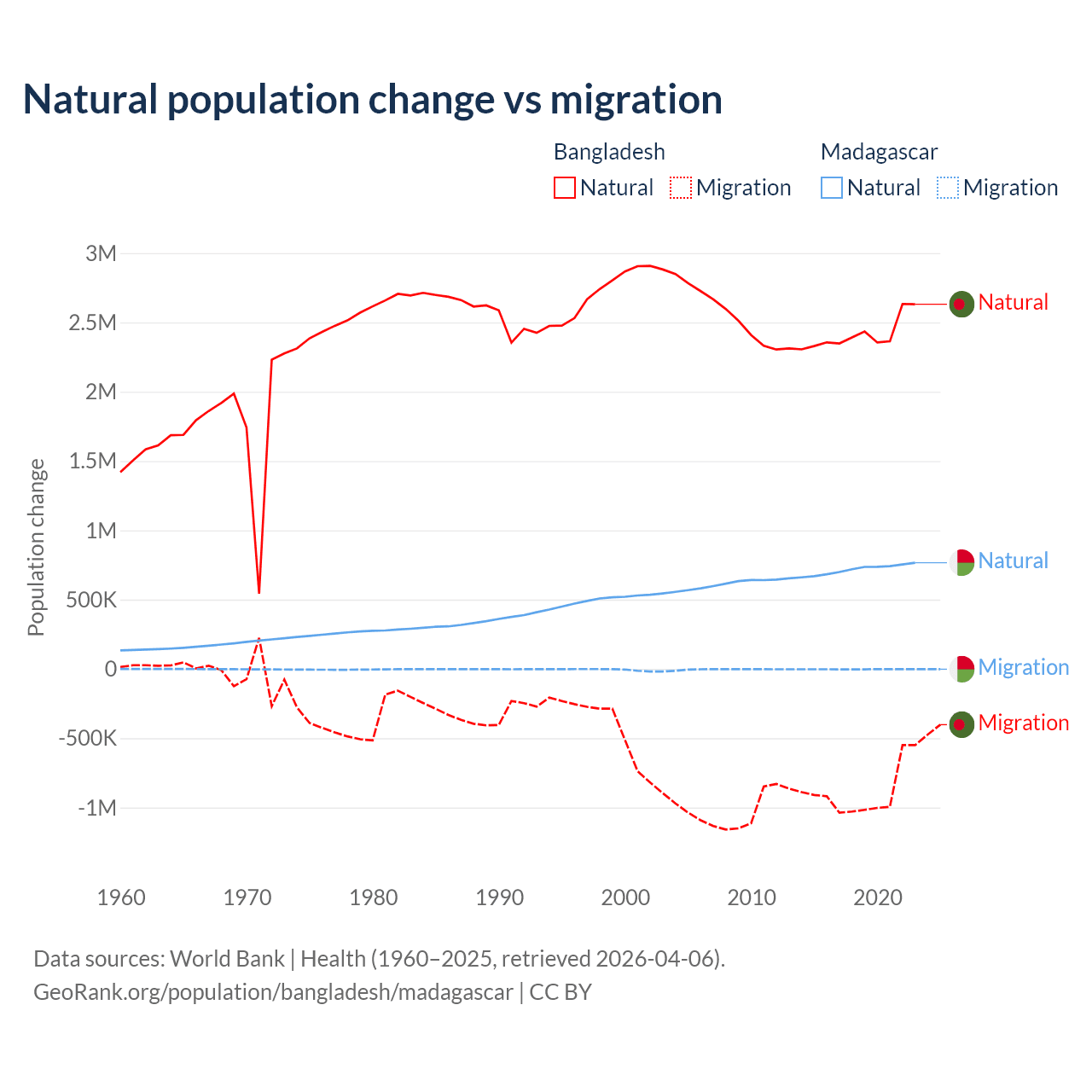 Over the last 10 years, 73.1% of the population change in Bangladesh is from natural causes (a gain of 24,148,039 people) and 26.9% is from migration (a loss of 8,897,408 people). In Madagascar 99.7% is from natural causes (a gain of 7,165,578 people) and 0.31% is from migration (a loss of 22,384 people).
