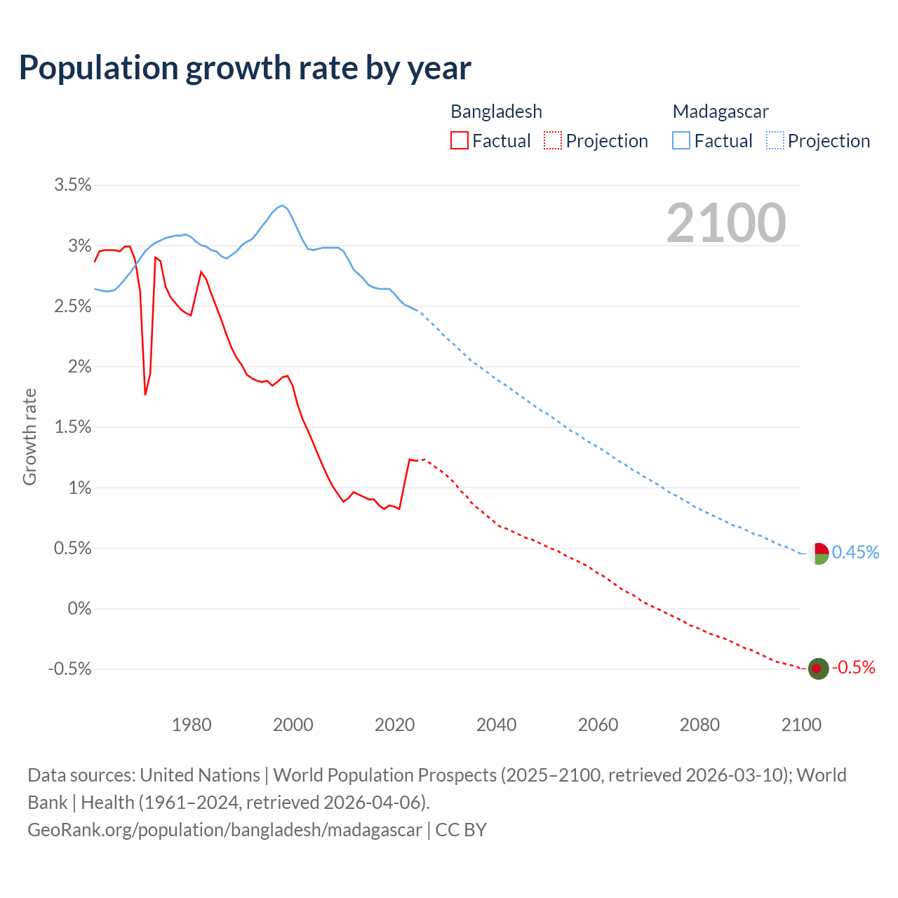 - For the last 10 years, Bangladesh has had an average growth rate of +0.94% per year vs +2.6% in Madagascar.