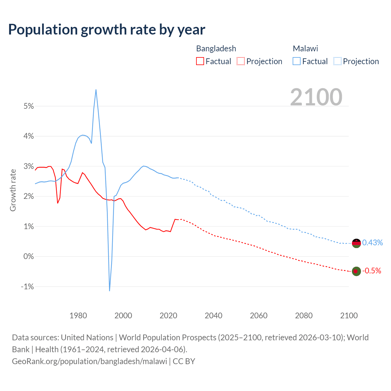 - For the last 10 years, Bangladesh has had an average growth rate of +0.94% per year vs +2.7% in Malawi.