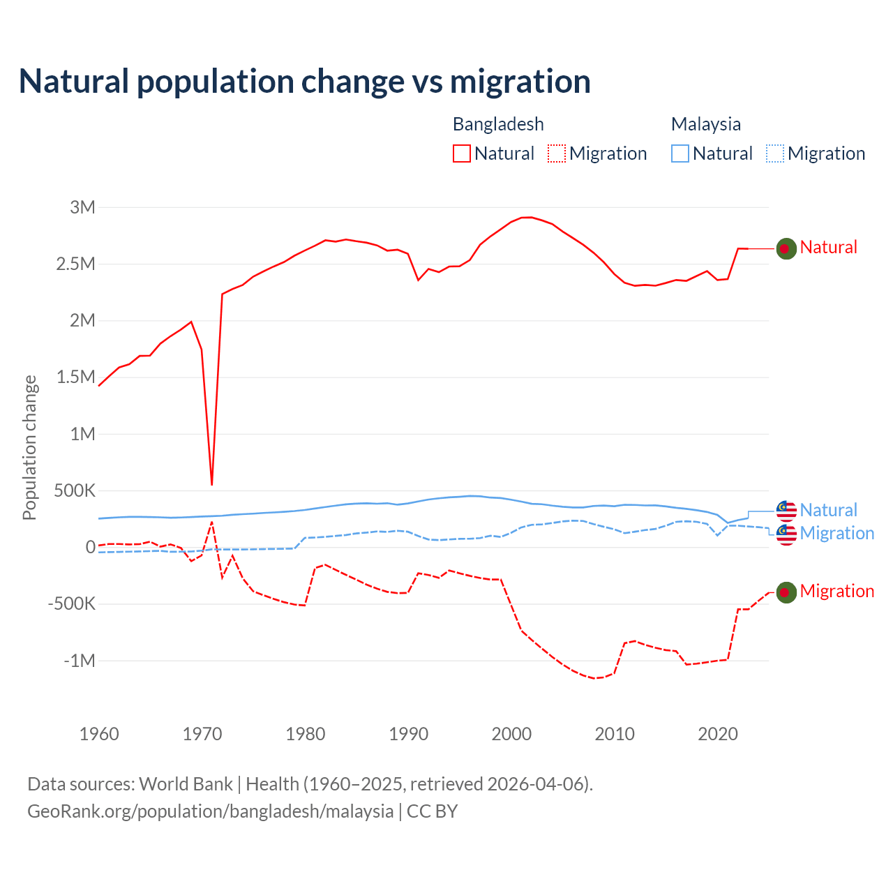 Over the last 10 years, 73.1% of the population change in Bangladesh is from natural causes (a gain of 24,148,039 people) and 26.9% is from migration (a loss of 8,897,408 people). In Malaysia 61.7% is from natural causes (a gain of 3,029,648 people) and 38.3% is from migration (a gain of 1,882,159 people).