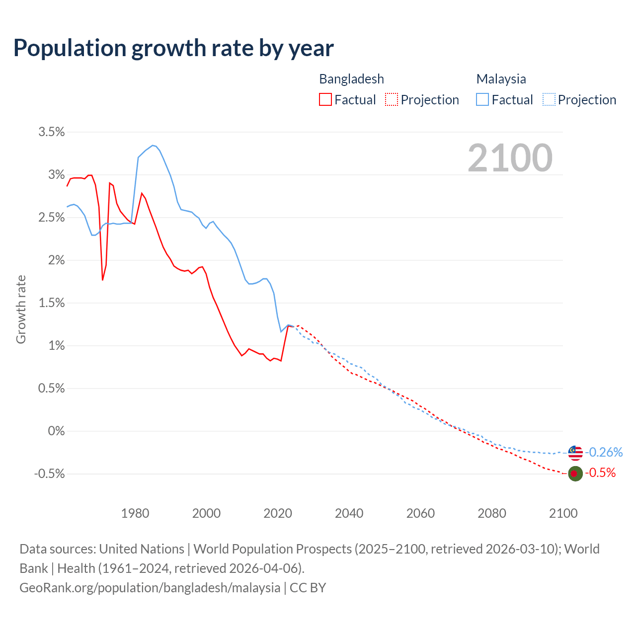 - For the last 10 years, Bangladesh has had an average growth rate of +0.94% per year vs +1.5% in Malaysia.