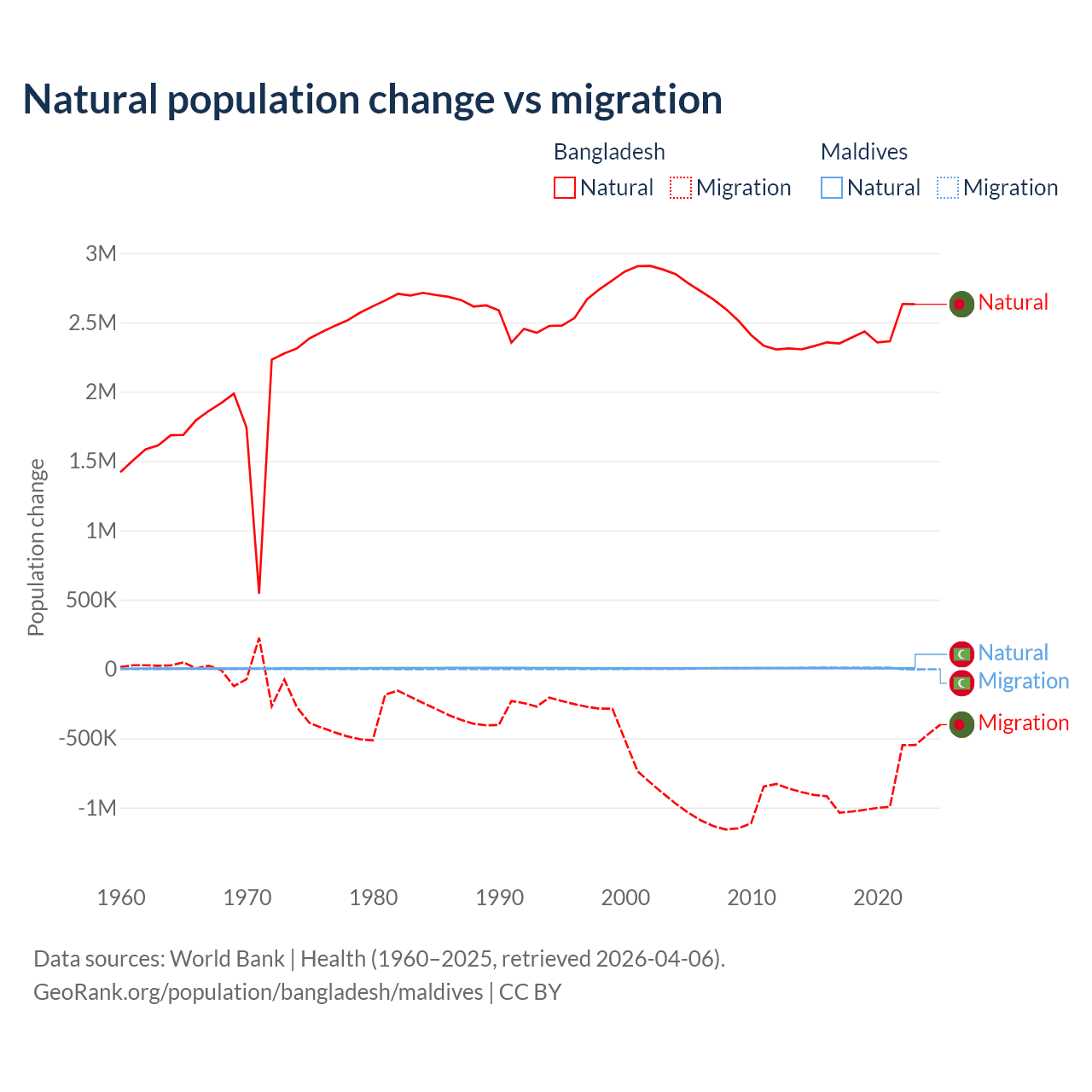 Over the last 10 years, 73.1% of the population change in Bangladesh is from natural causes (a gain of 24,148,039 people) and 26.9% is from migration (a loss of 8,897,408 people). In Maldives 42.7% is from natural causes (a gain of 51,342 people) and 57.3% is from migration (a gain of 68,788 people).