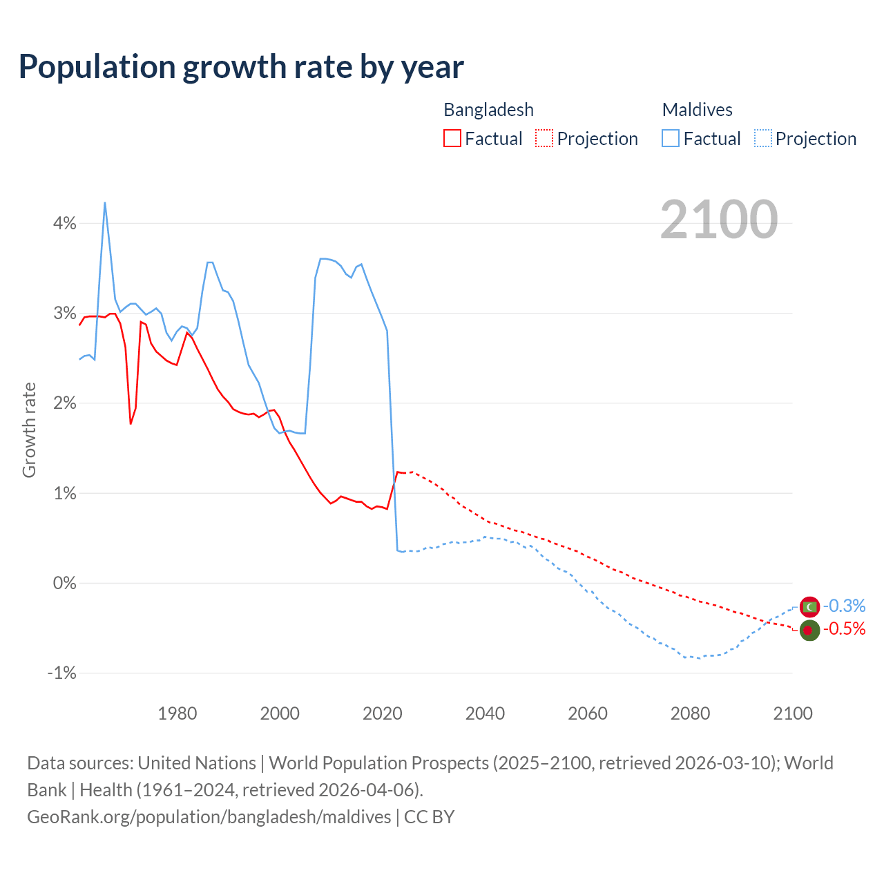 - For the last 10 years, Bangladesh has had an average growth rate of +0.94% per year vs +2.56% in Maldives.