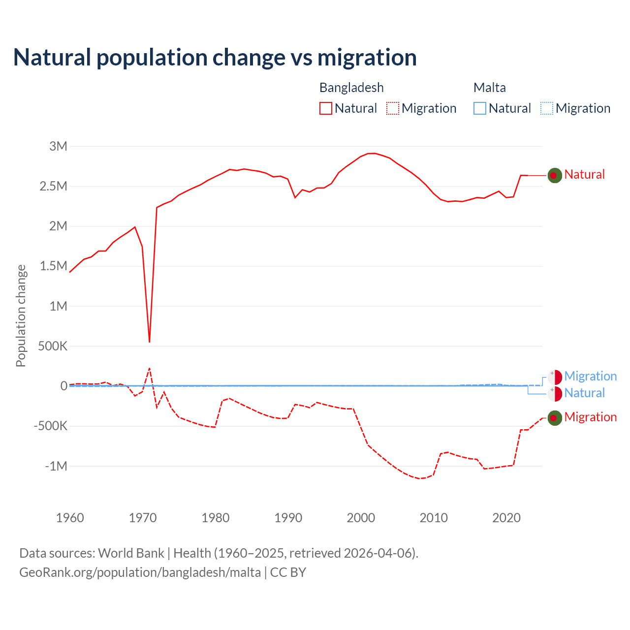 Over the last 10 years, 73.1% of the population change in Bangladesh is from natural causes (a gain of 24,148,039 people) and 26.9% is from migration (a loss of 8,897,408 people). In Malta 5.84% is from natural causes (a gain of 6,181 people) and 94.2% is from migration (a gain of 99,652 people).
