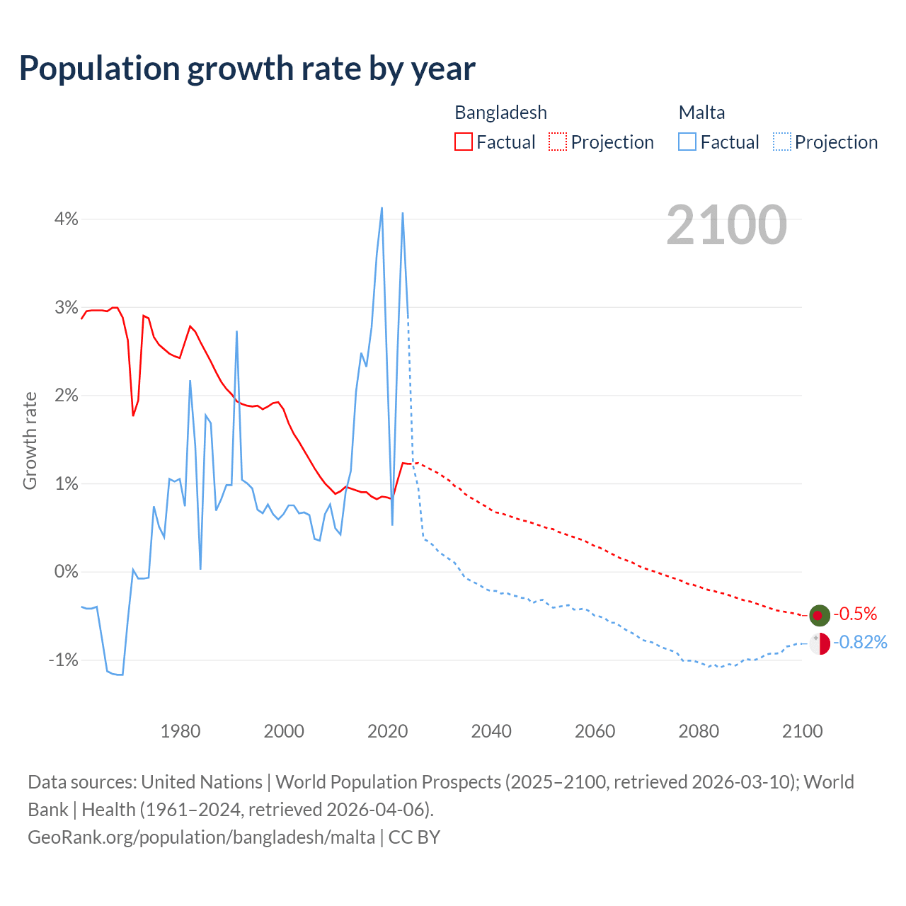 - For the last 10 years, Bangladesh has had an average growth rate of +0.94% per year vs +2.69% in Malta.