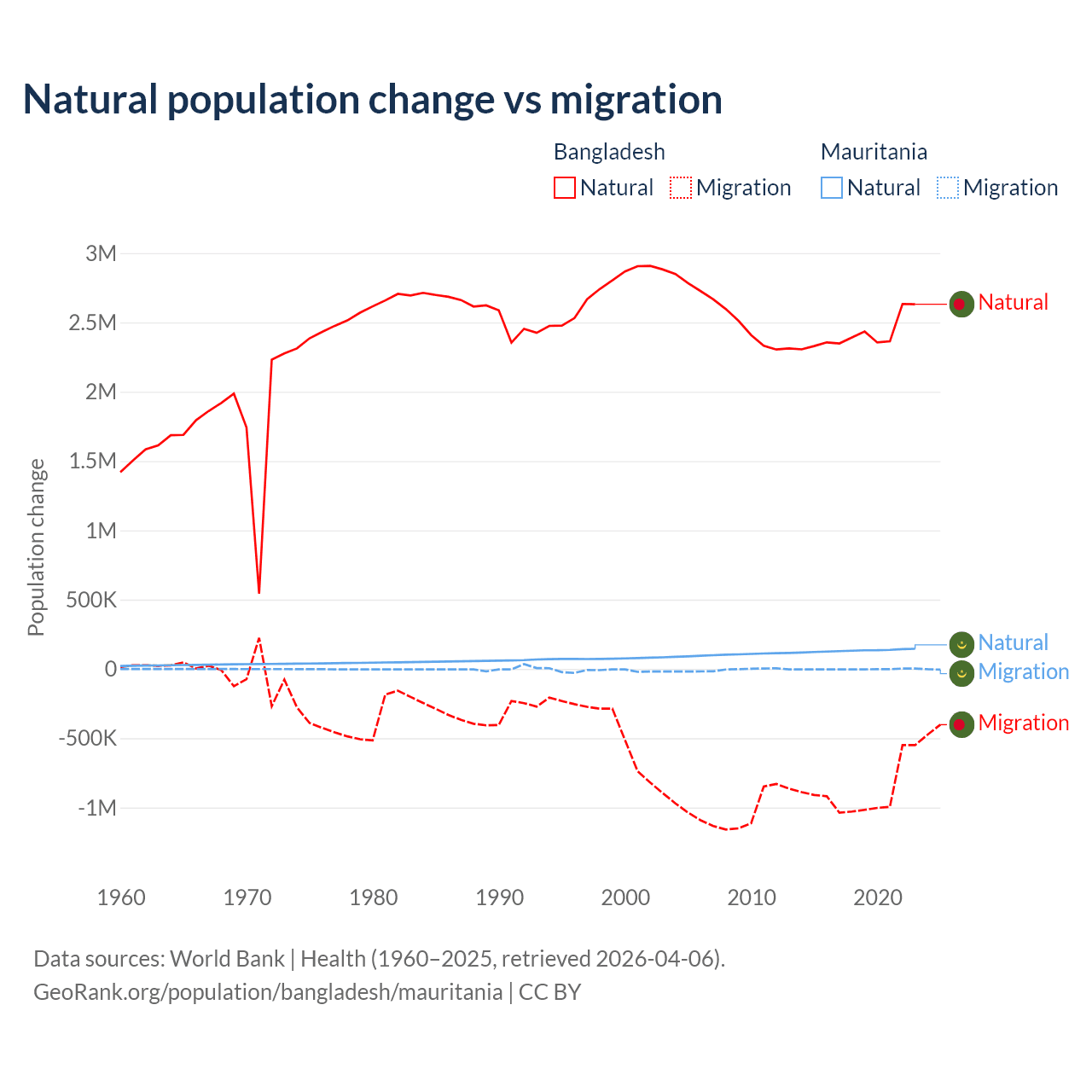 Over the last 10 years, 73.1% of the population change in Bangladesh is from natural causes (a gain of 24,148,039 people) and 26.9% is from migration (a loss of 8,897,408 people). In Mauritania 98.9% is from natural causes (a gain of 1,320,903 people) and 1.12% is from migration (a loss of 14,982 people).