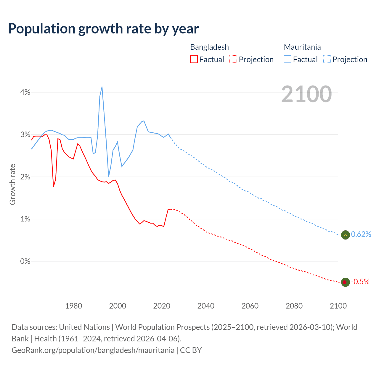 - For the last 10 years, Bangladesh has had an average growth rate of +0.94% per year vs +3% in Mauritania.
