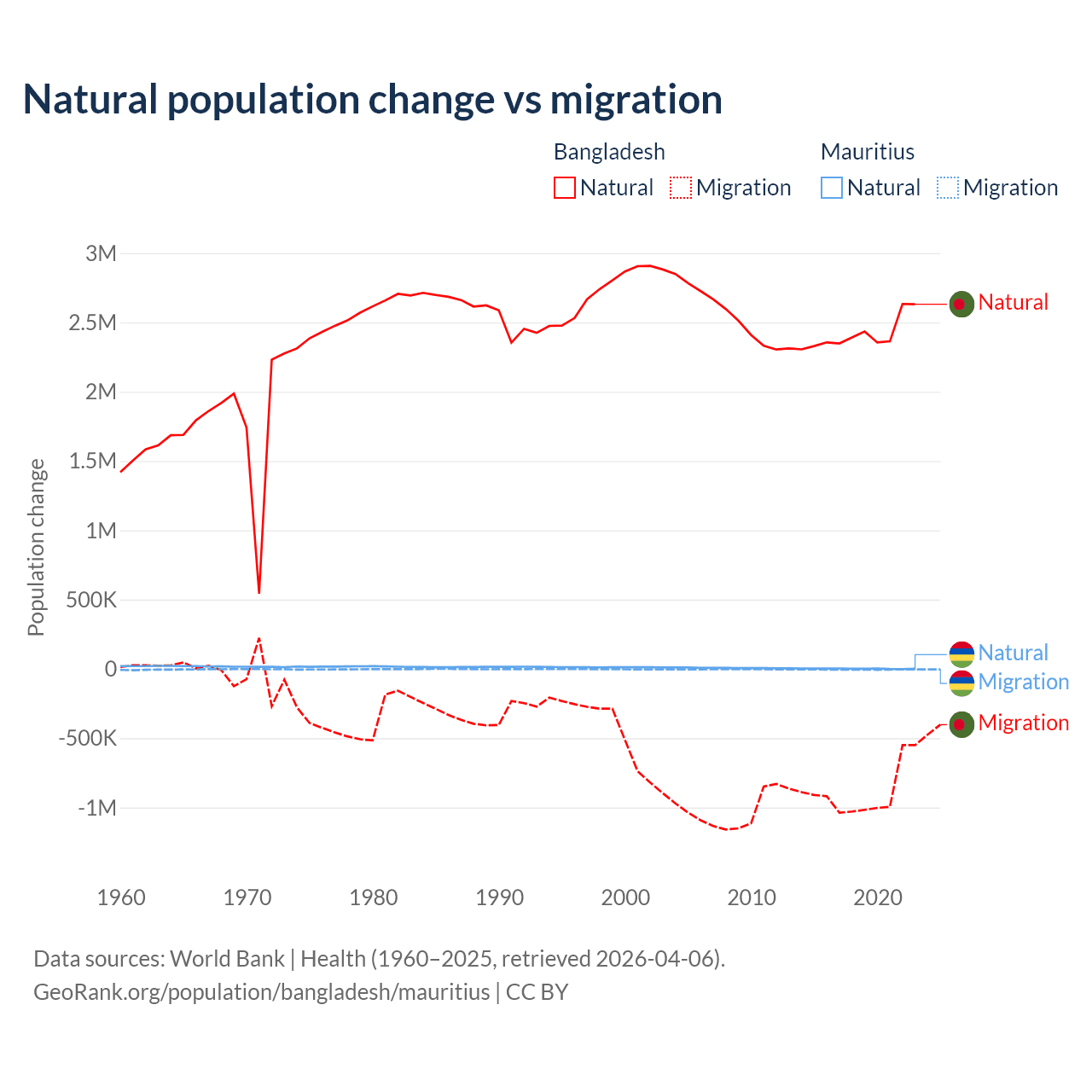 Over the last 10 years, 73.1% of the population change in Bangladesh is from natural causes (a gain of 24,148,039 people) and 26.9% is from migration (a loss of 8,897,408 people). In Mauritius 30.9% is from natural causes (a gain of 19,327 people) and 69.1% is from migration (a loss of 43,294 people).