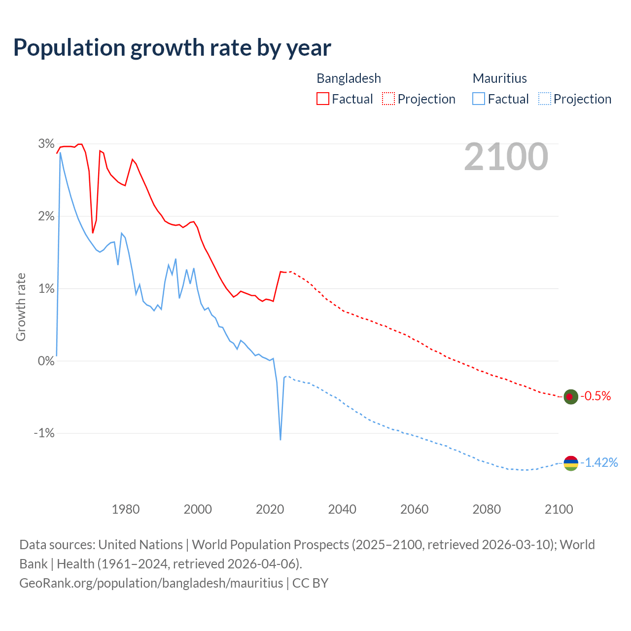 - For the last 10 years, Bangladesh has had an average growth rate of +0.94% per year vs -0.09% in Mauritius.