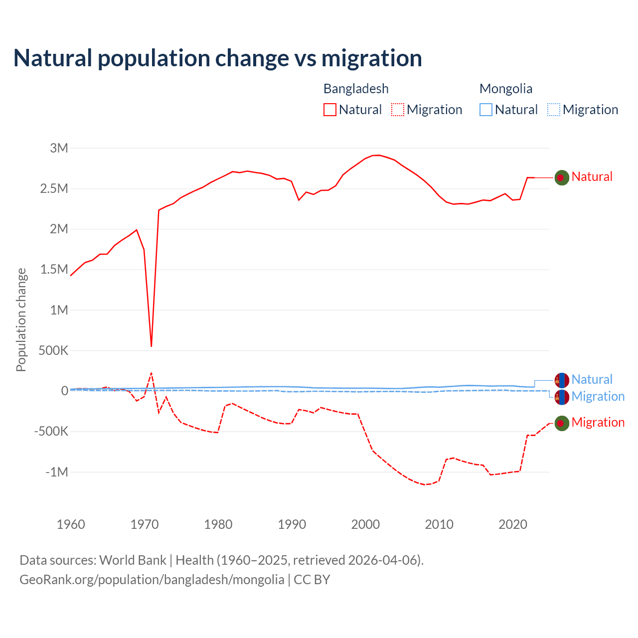 Over the last 10 years, 73.1% of the population change in Bangladesh is from natural causes (a gain of 24,148,039 people) and 26.9% is from migration (a loss of 8,897,408 people). In Mongolia 94.1% is from natural causes (a gain of 580,367 people) and 5.87% is from migration (a gain of 36,163 people).