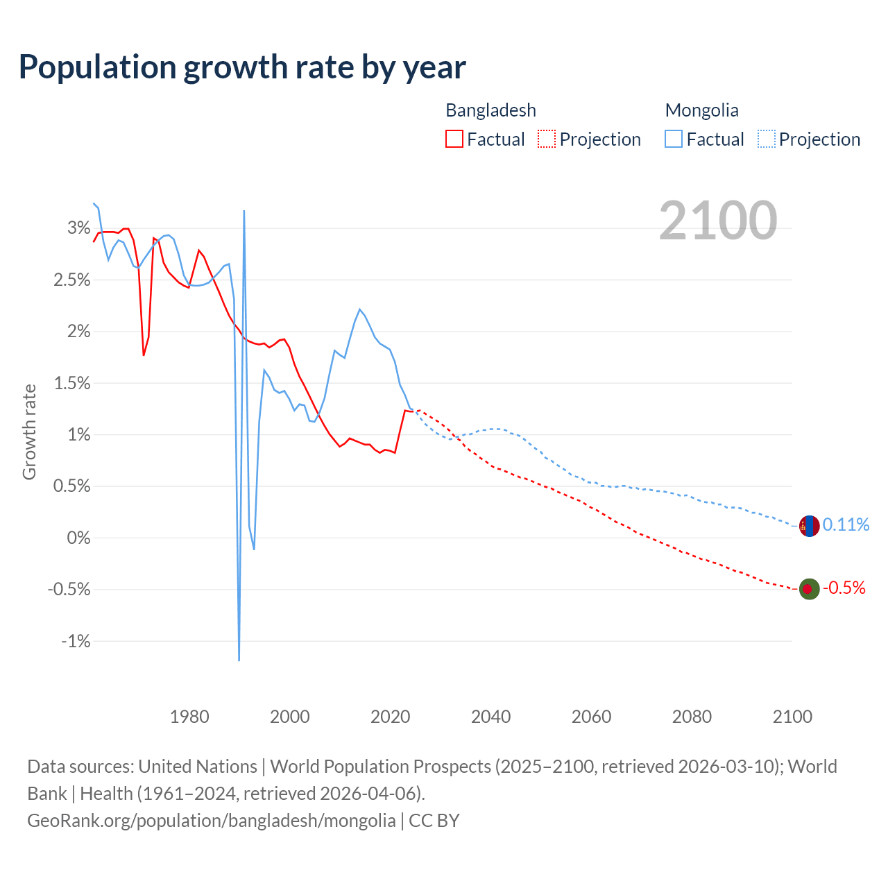- For the last 10 years, Bangladesh has had an average growth rate of +0.94% per year vs +1.79% in Mongolia.