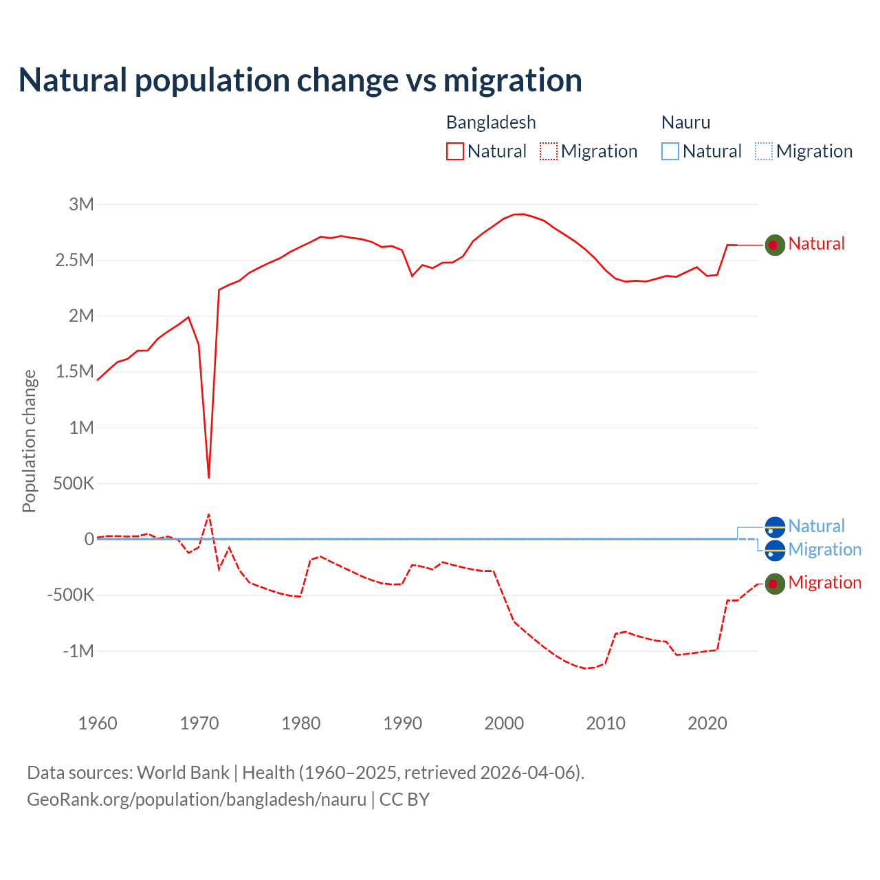 Over the last 10 years, 73.1% of the population change in Bangladesh is from natural causes (a gain of 24,148,039 people) and 26.9% is from migration (a loss of 8,897,408 people). In Nauru 66.2% is from natural causes (a gain of 2,590 people) and 33.8% is from migration (a loss of 1,320 people).