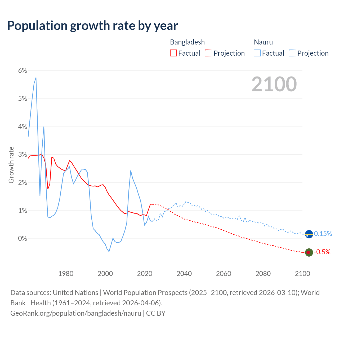 - For the last 10 years, Bangladesh has had an average growth rate of +0.94% per year vs +1.17% in Nauru.