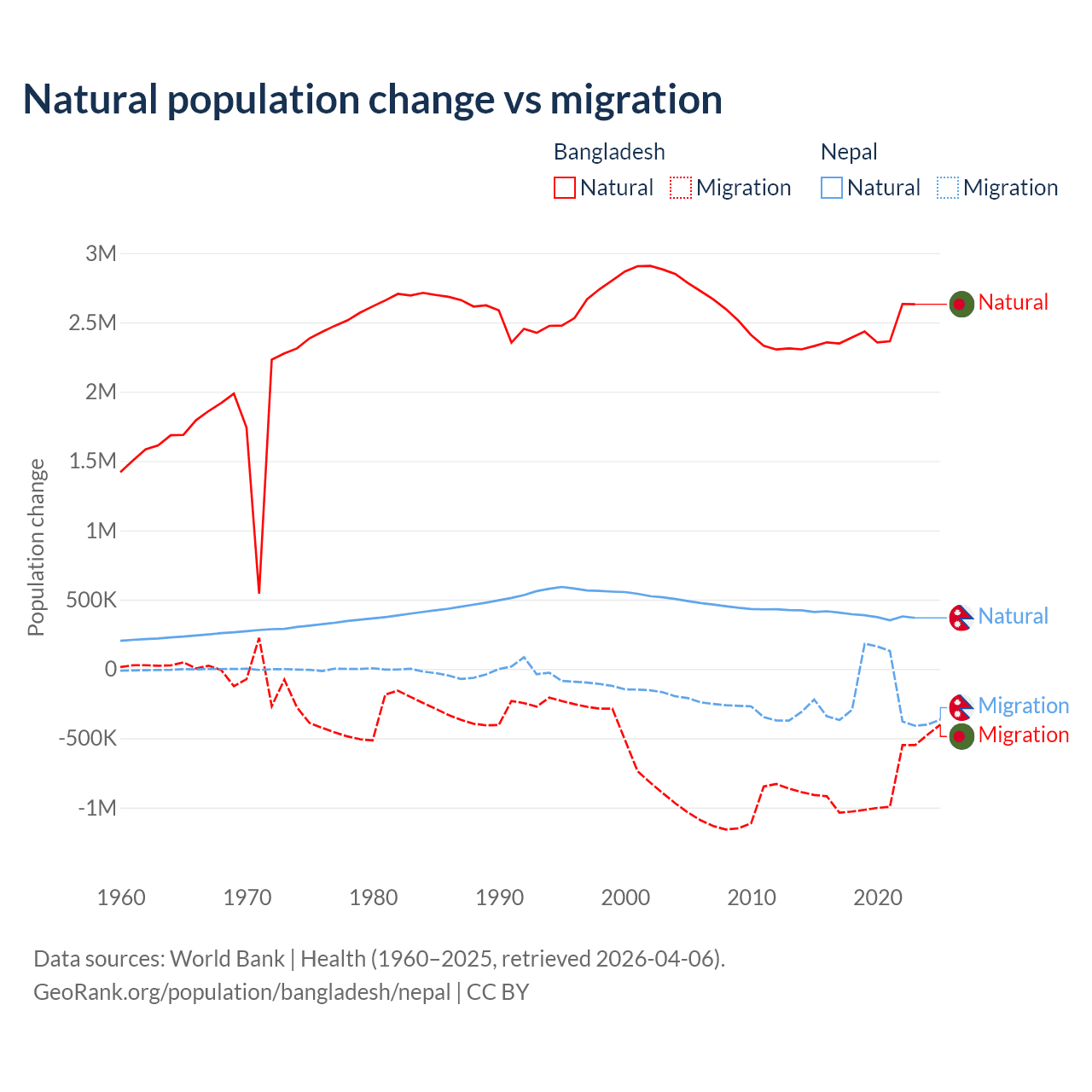 Over the last 10 years, 73.1% of the population change in Bangladesh is from natural causes (a gain of 24,148,039 people) and 26.9% is from migration (a loss of 8,897,408 people). In Nepal 67.9% is from natural causes (a gain of 3,909,749 people) and 32.1% is from migration (a loss of 1,851,664 people).