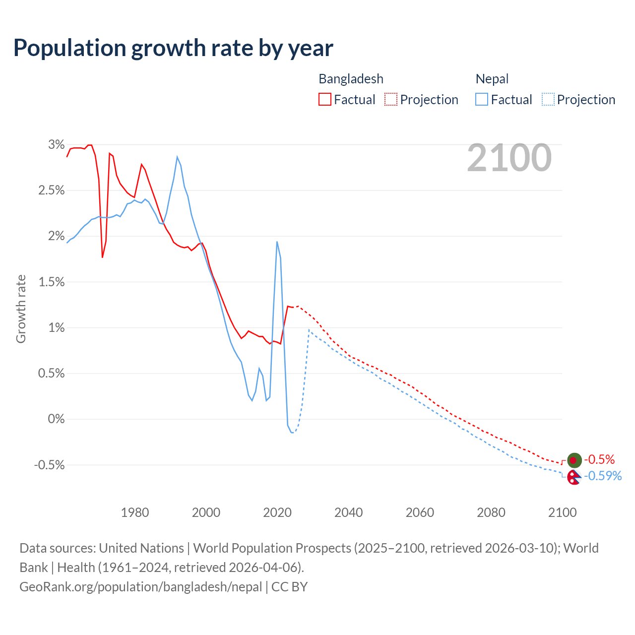 - For the last 10 years, Bangladesh has had an average growth rate of +0.94% per year vs +0.66% in Nepal.