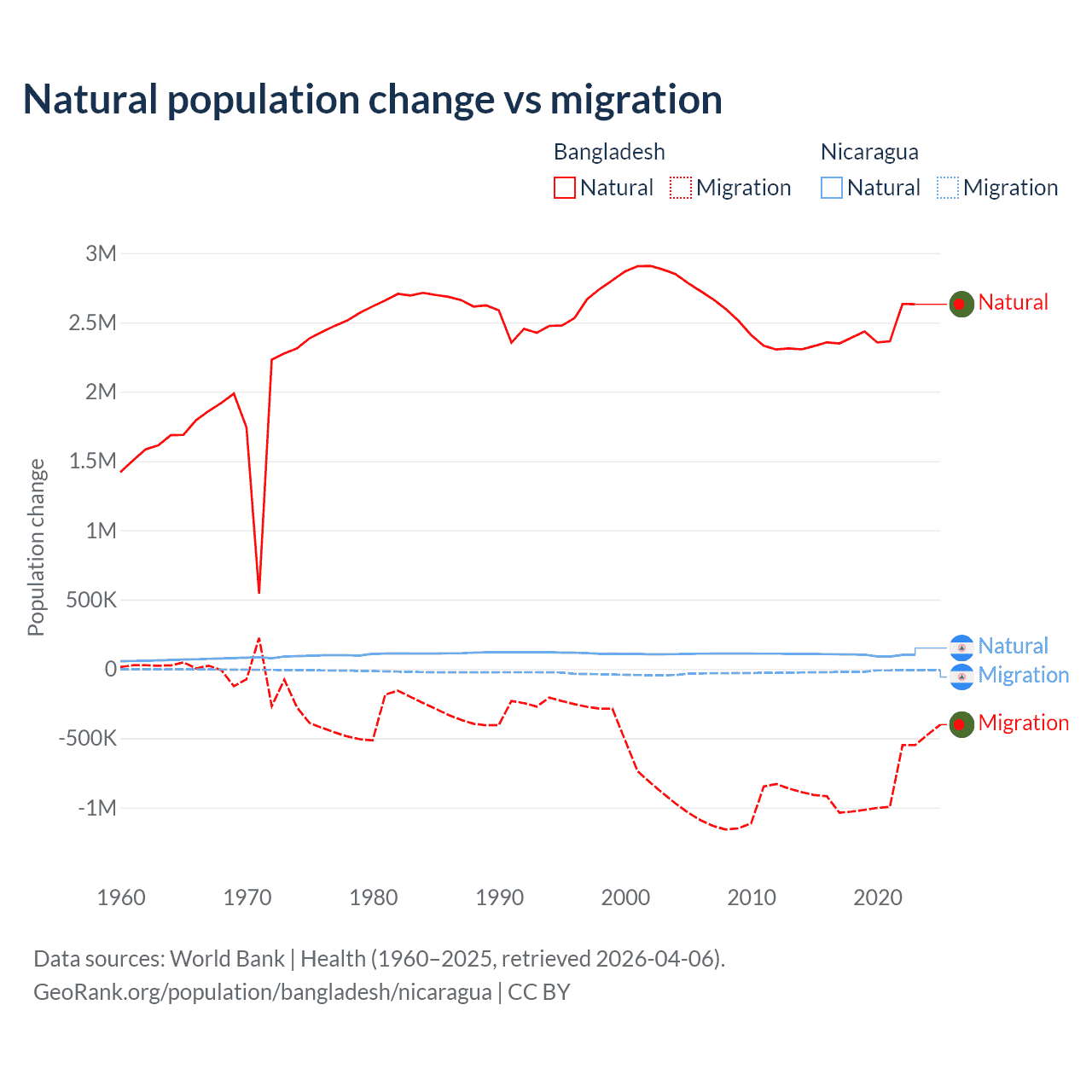 Over the last 10 years, 73.1% of the population change in Bangladesh is from natural causes (a gain of 24,148,039 people) and 26.9% is from migration (a loss of 8,897,408 people). In Nicaragua 85.5% is from natural causes (a gain of 1,017,084 people) and 14.5% is from migration (a loss of 172,078 people).