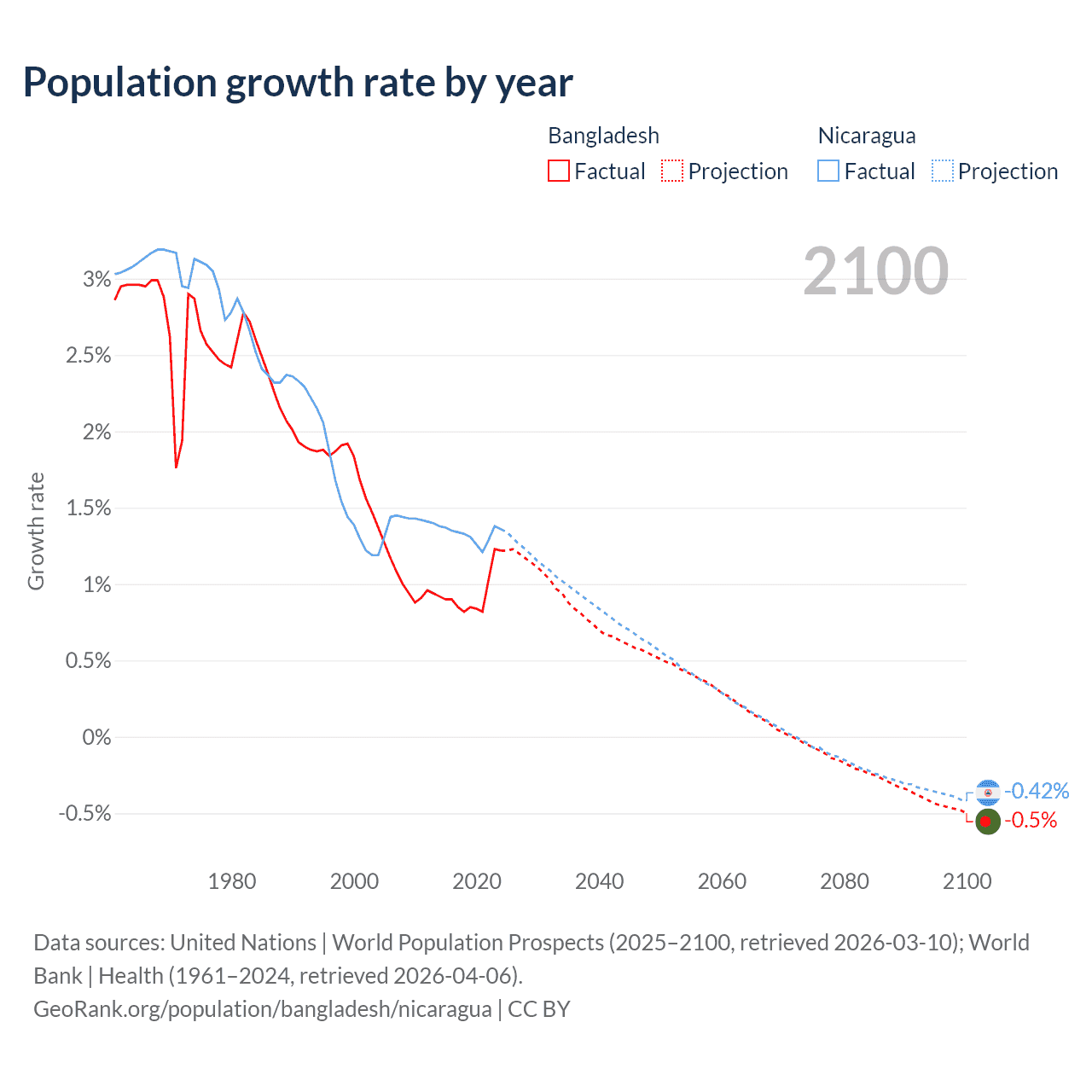 - For the last 10 years, Bangladesh has had an average growth rate of +0.94% per year vs +1.33% in Nicaragua.