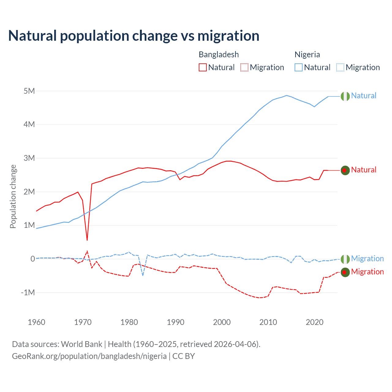 Over the last 10 years, 73.1% of the population change in Bangladesh is from natural causes (a gain of 24,148,039 people) and 26.9% is from migration (a loss of 8,897,408 people). In Nigeria 99.2% is from natural causes (a gain of 47,163,517 people) and 0.77% is from migration (a loss of 368,103 people).