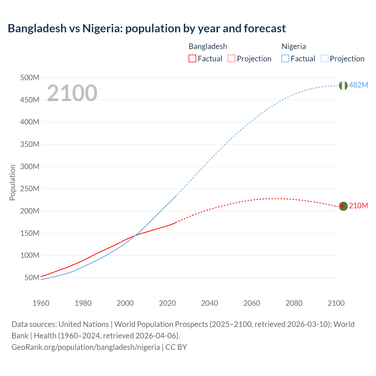 Bangladesh vs Nigeria: population by year and forecast
