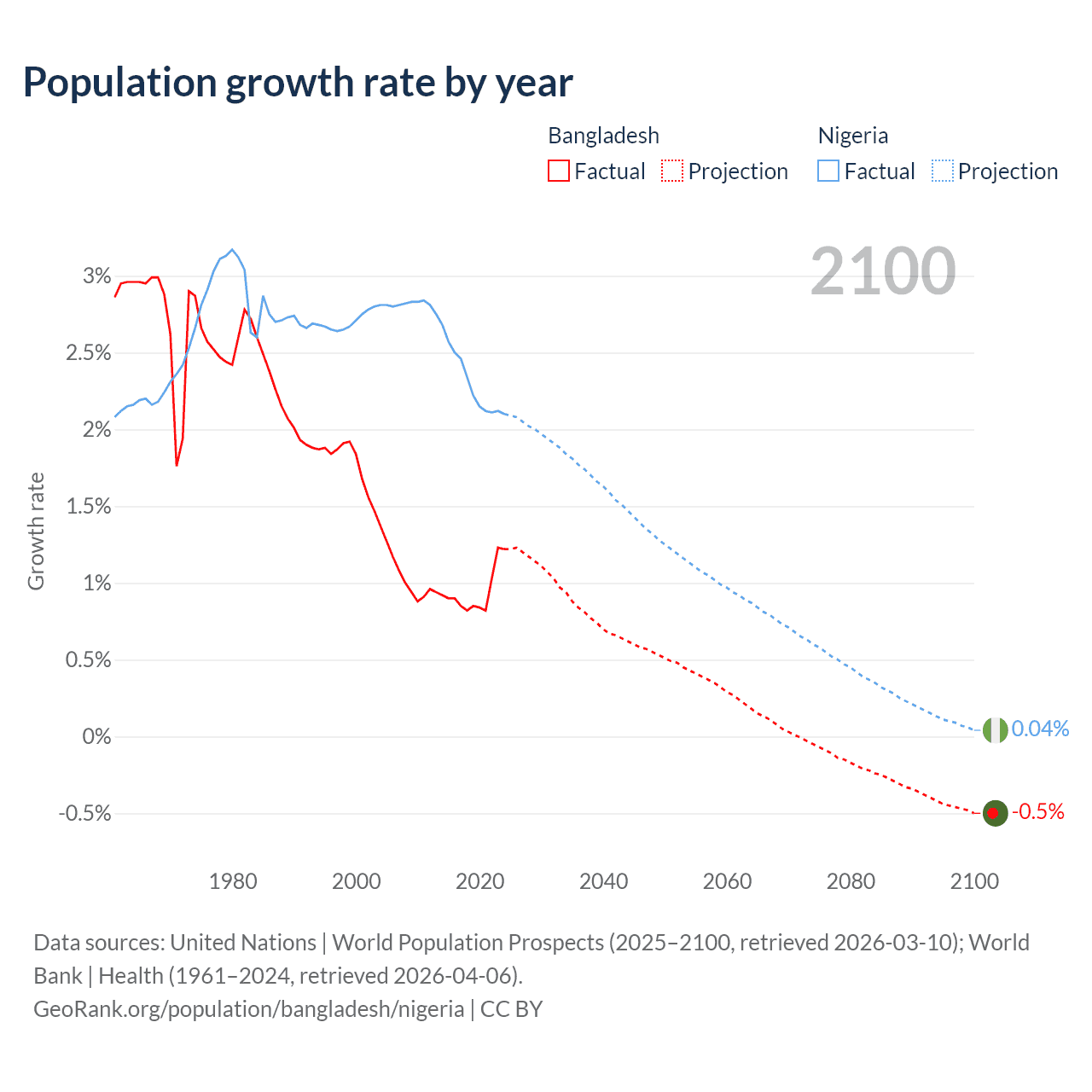 Data sources: World Bank | Health (1960–2024, retrieved 2026-04-06); United Nations | World Population Prospects (1960–2026, retrieved 2026-03-10); U.S. Census Bureau (1960–2025, retrieved 2026-02-08); Central Intelligence Agency (CIA) (2000–2019, retrieved 2026-02-20).