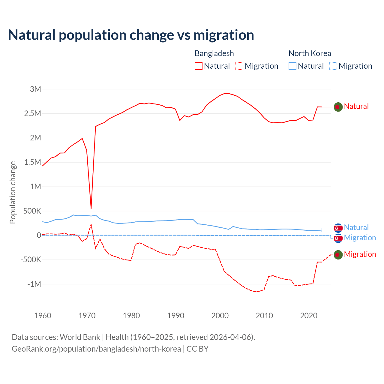 Over the last 10 years, 73.1% of the population change in Bangladesh is from natural causes (a gain of 24,148,039 people) and 26.9% is from migration (a loss of 8,897,408 people). In North Korea 97.7% is from natural causes (a gain of 1,097,372 people) and 2.33% is from migration (a loss of 26,227 people).