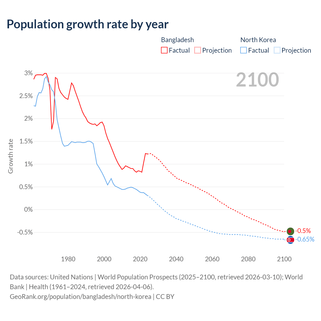 - For the last 10 years, Bangladesh has had an average growth rate of +0.94% per year vs +0.41% in North Korea.