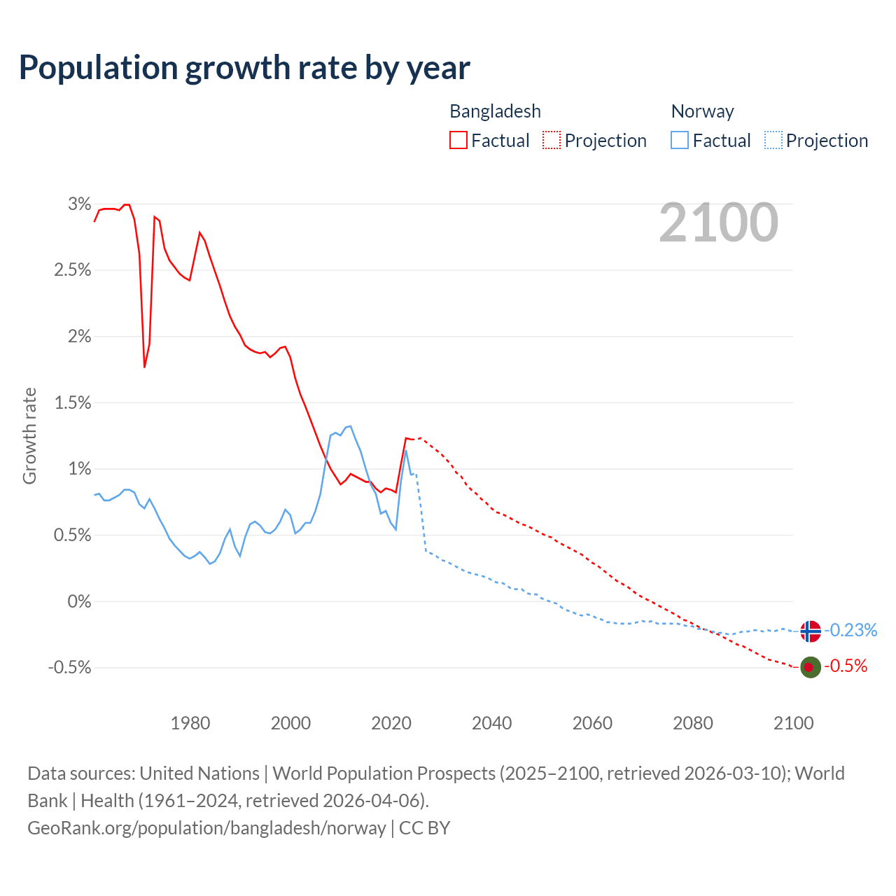 - For the last 10 years, Bangladesh has had an average growth rate of +0.94% per year vs +0.85% in Norway.