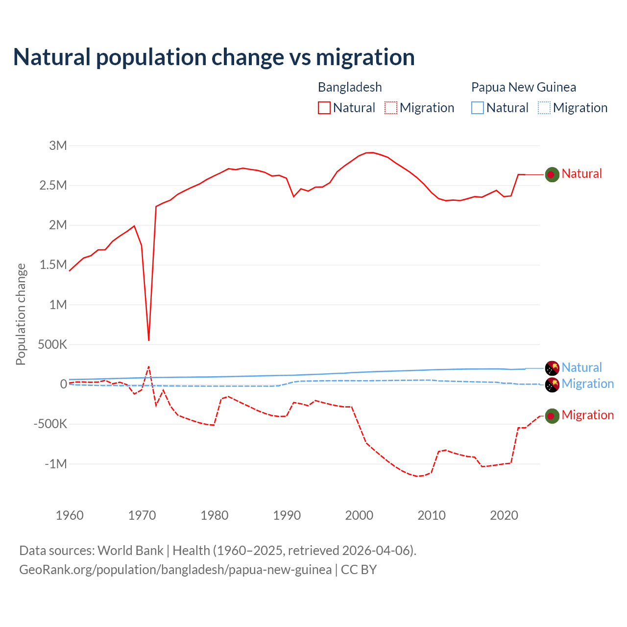 Over the last 10 years, 73.1% of the population change in Bangladesh is from natural causes (a gain of 24,148,039 people) and 26.9% is from migration (a loss of 8,897,408 people). In Papua New Guinea 91% is from natural causes (a gain of 1,883,906 people) and 8.98% is from migration (a gain of 185,900 people).