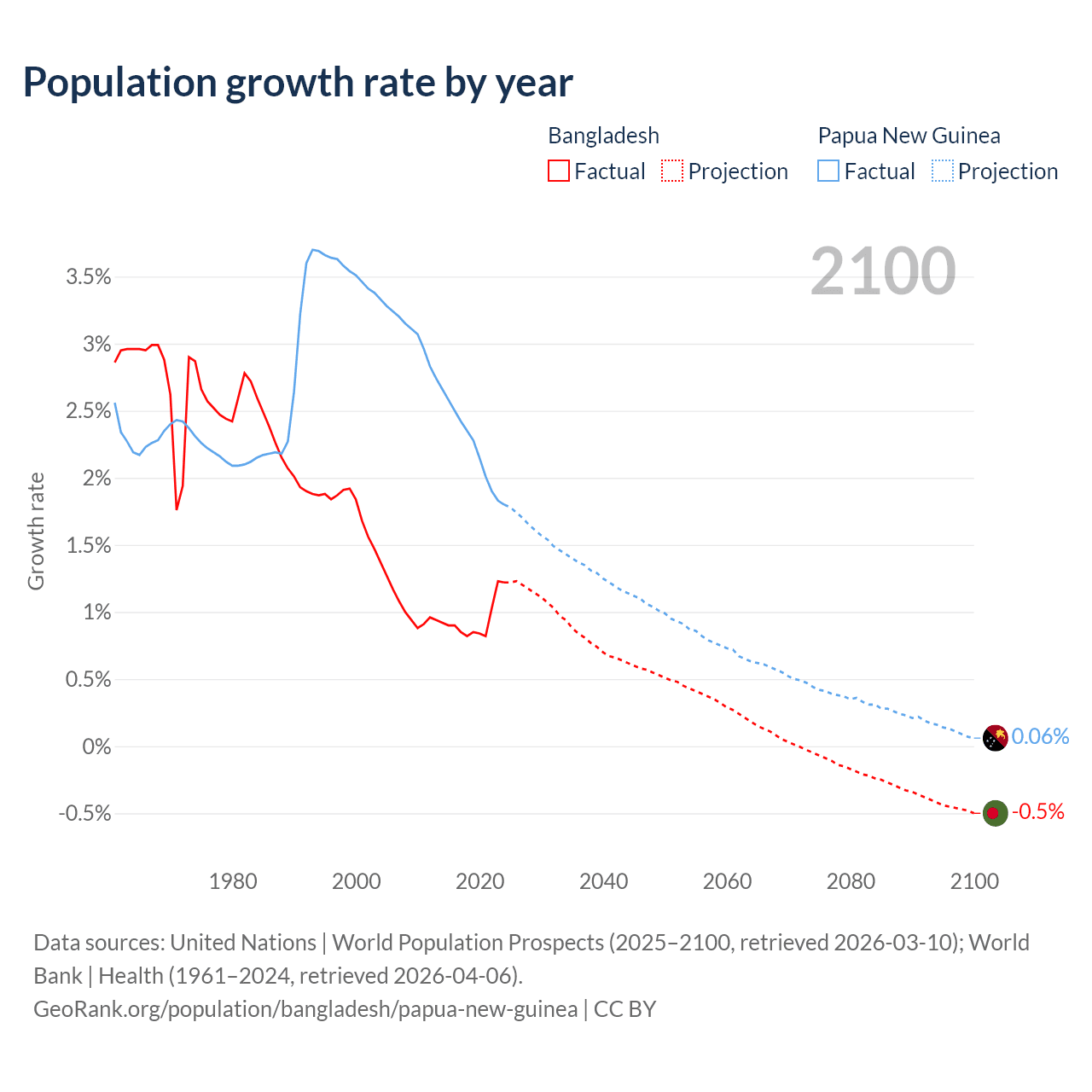 - For the last 10 years, Bangladesh has had an average growth rate of +0.94% per year vs +2.23% in Papua New Guinea.