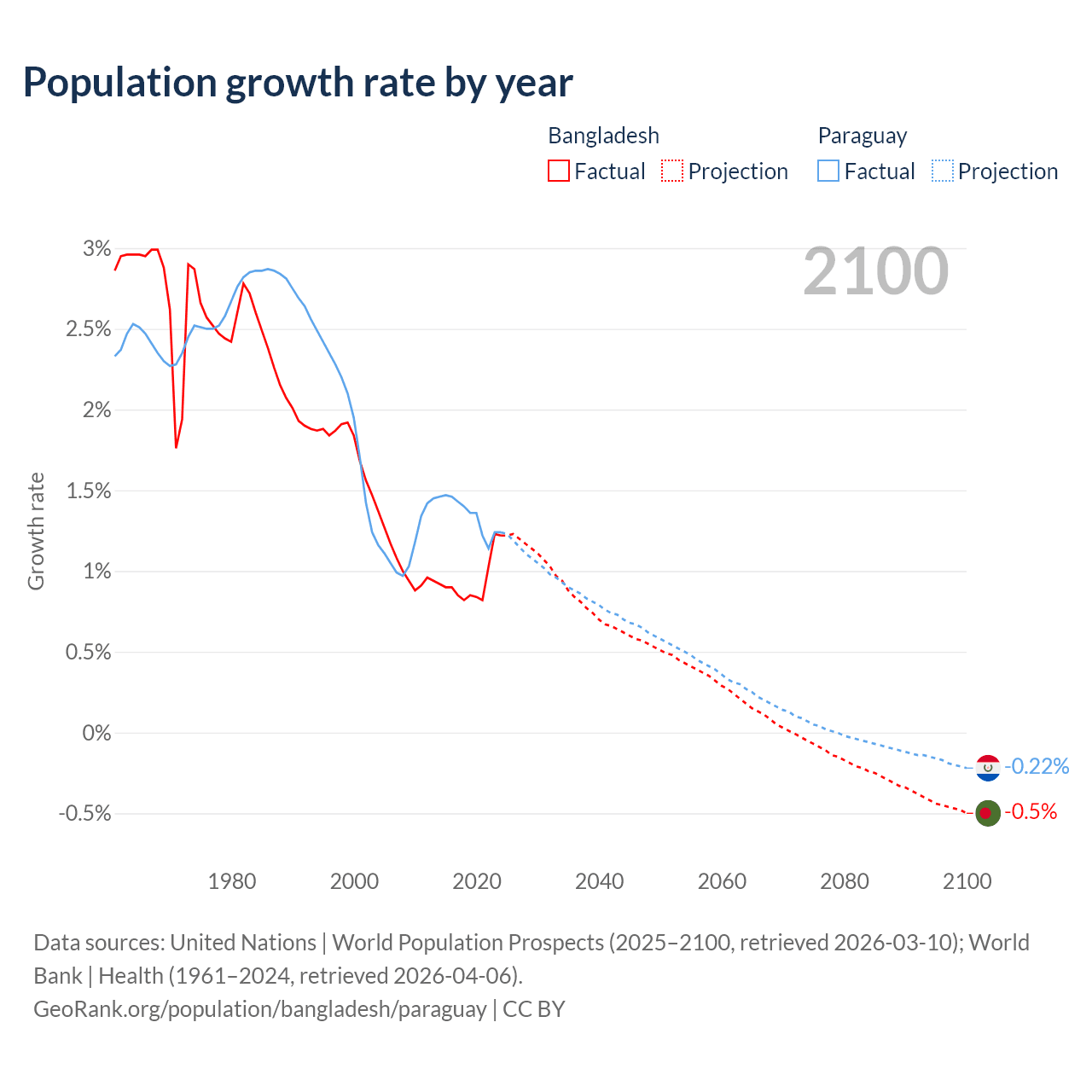 - For the last 10 years, Bangladesh has had an average growth rate of +0.94% per year vs +1.34% in Paraguay.
