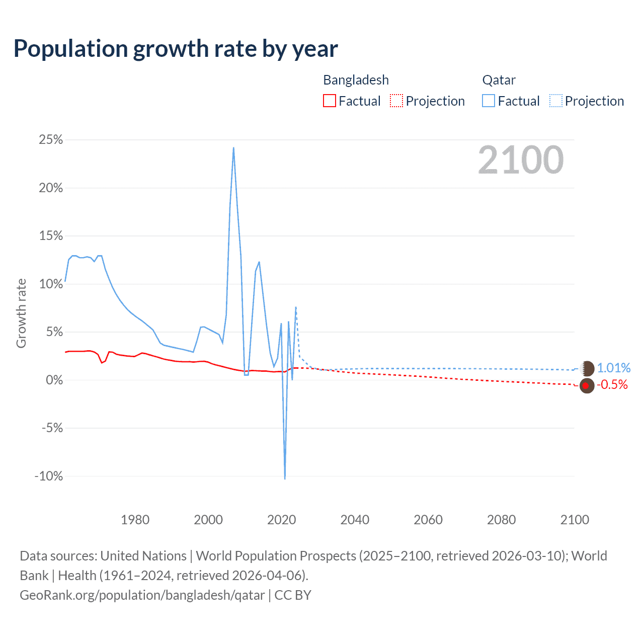 - For the last 10 years, Bangladesh has had an average growth rate of +0.94% per year vs +3.86% in Qatar.
