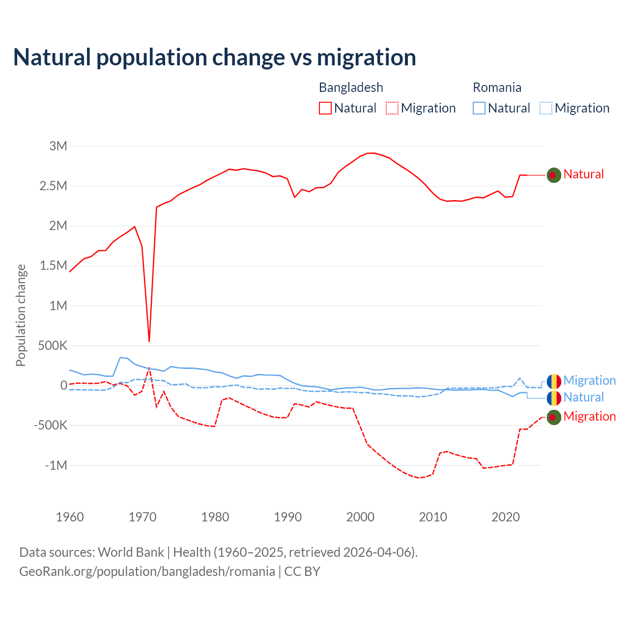 Over the last 10 years, 73.1% of the population change in Bangladesh is from natural causes (a gain of 24,148,039 people) and 26.9% is from migration (a loss of 8,897,408 people). In Romania 82% is from natural causes (a loss of 766,295 people) and 18% is from migration (a loss of 167,917 people).