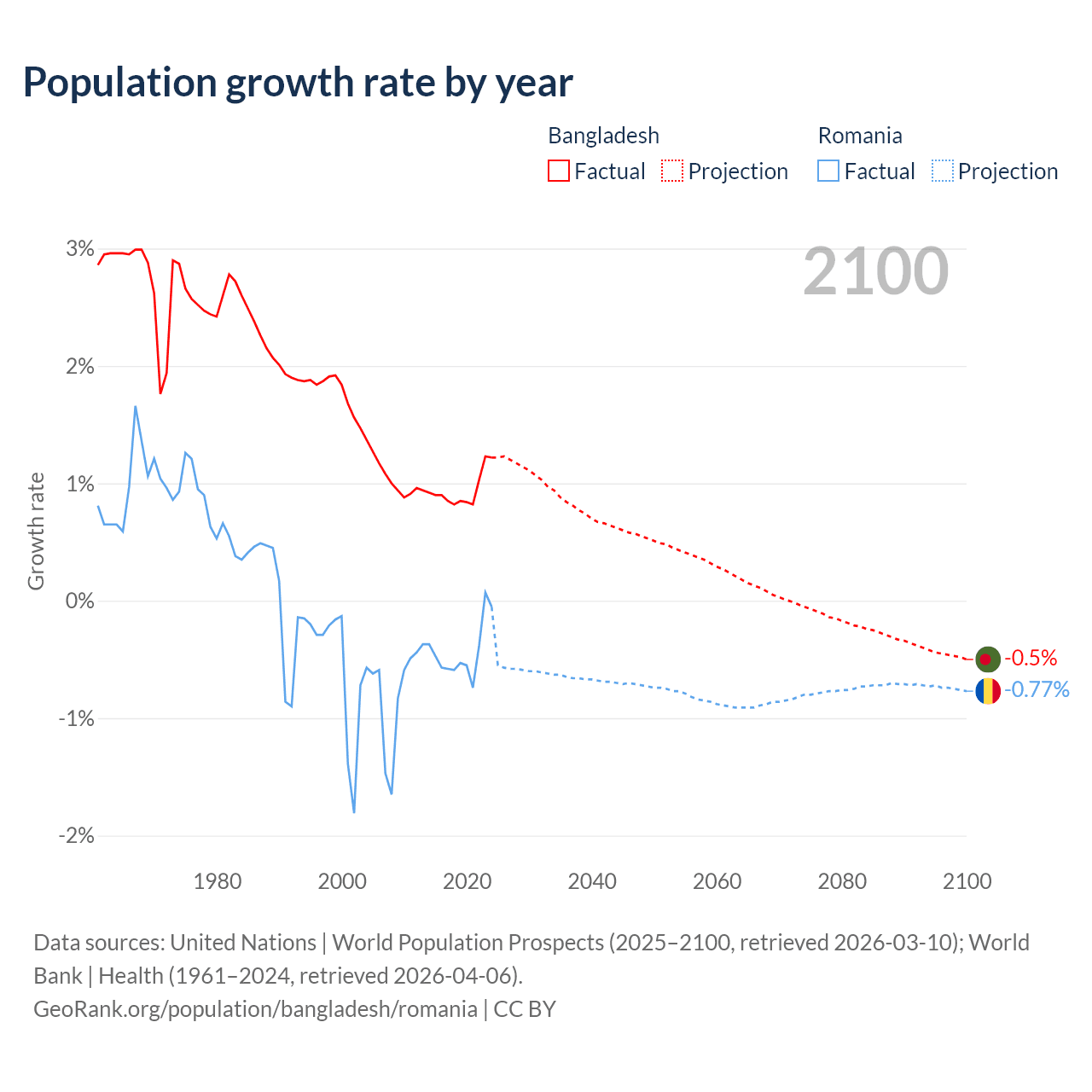 - For the last 10 years, Bangladesh has had an average growth rate of +0.94% per year vs -0.43% in Romania.